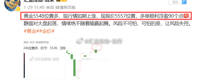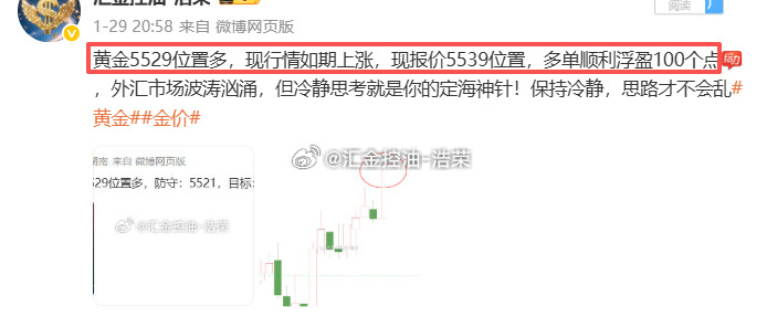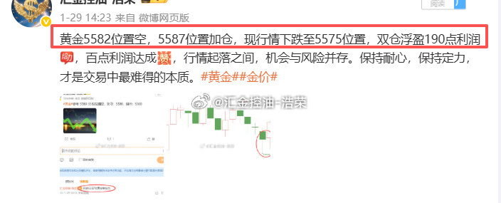 2026.1.29日博文公布5单,全胜!共收割930个点,投资如战场,攻守皆为谋略。当风险远超收益时,理性撤退,远胜一时侥幸取胜。投资的最高境界,从不是追逐短期趋势,而是站在全局视角,看清当下、预判未来。静心观望,复盘得失,沉淀经验,待时机明朗,再果断出击,一击制胜。黄金金价