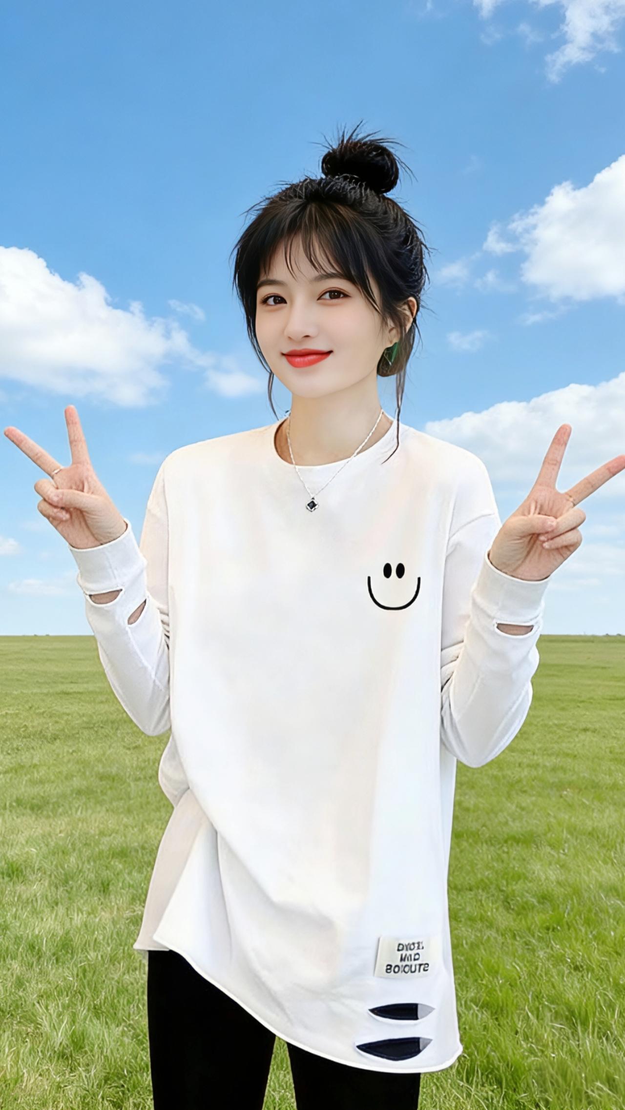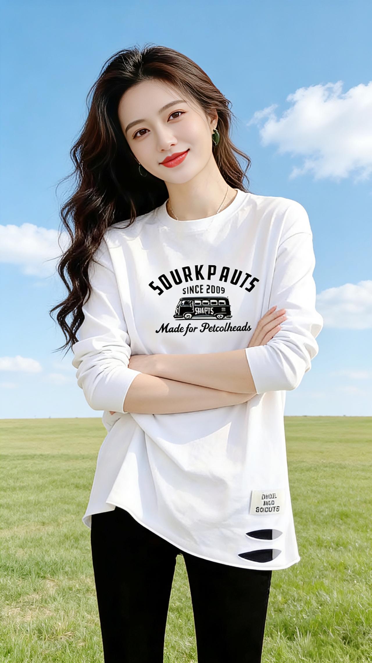 风掠过草坪时,带着青草与阳光的气息,把衣角轻轻掀起。 她坐在草色里,丸子头的碎发被风撩起,像春日里最柔软的云。白衫上的粉心图案,在蓝天的映衬下,像一颗被妥帖安放的温柔心事;或是站着时,双臂张开,让风穿过袖口,把笑意也吹得更亮。 那些印在衣料上的文字与图案,是时光的注脚——有复古巴士载着旧梦,有金色帽檐藏着少年心气,也有简单的笑脸,把日子熨帖得柔软又明亮。 她时而抱臂而立,像在与世界温柔对峙;时而抬手轻挥,像在和路过的风打招呼;时而席地而坐,让草叶蹭过裤脚,把喧嚣都关在视野之外。 白衫是画布,她是行走的诗。每一次转身,每一个微笑,都在把平凡的日常,晕染成一幅流动的画。风还在吹,草还在长,而她站在那里,就成了整个春天最动人的注脚。 早春穿搭长袖t恤 肉肉女孩的早春有效穿搭 分享我的年度穿搭 面料柔软舒适胖瘦都能穿 @抖家上热门 @DOU+上热门 @抖加🔥上热门🔥dou+🔥热点宝