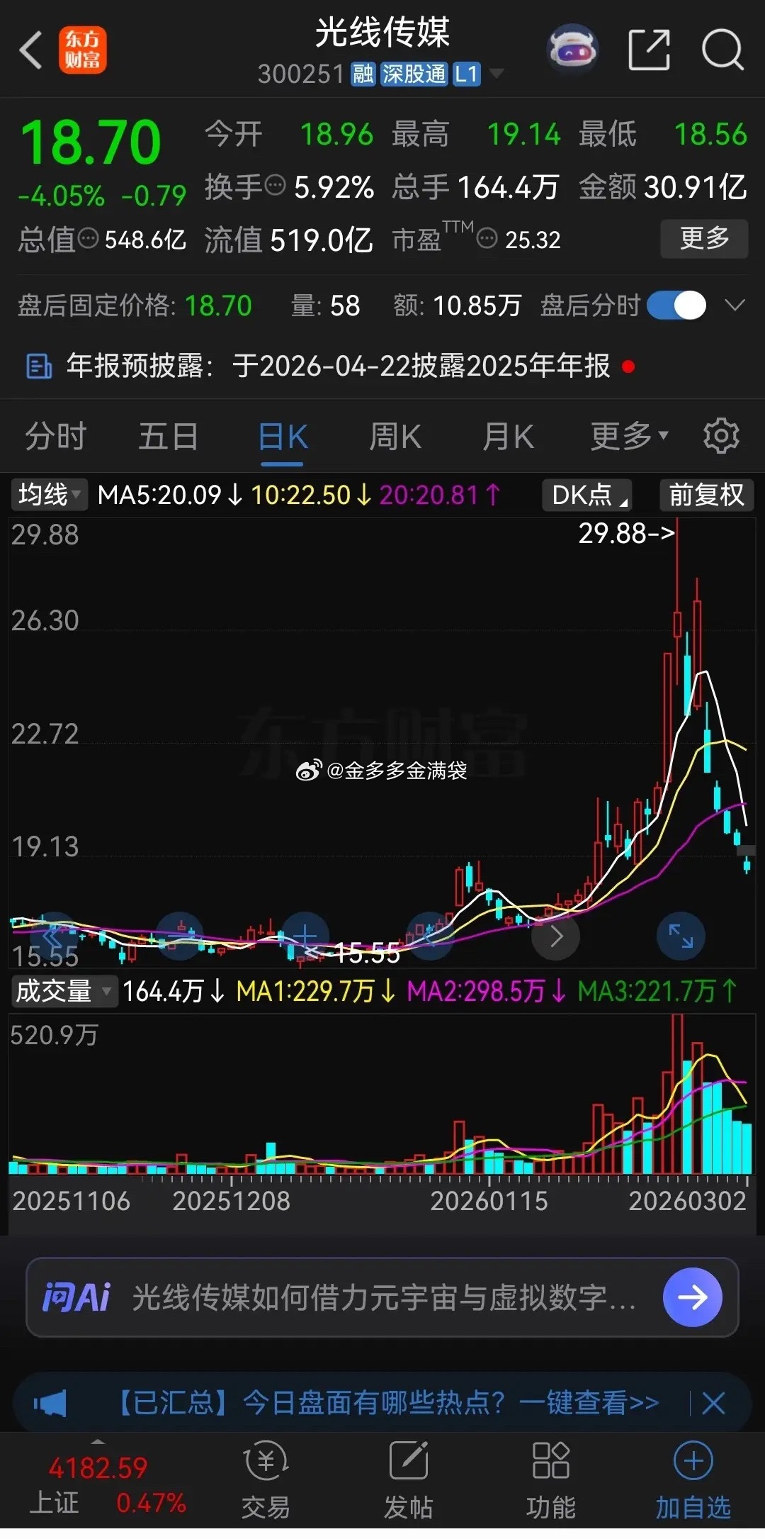 结果做梦都没有想到,节后影视院线股全线大跌,光线传媒20厘米跌停,随后又一路崩盘式下跌四天,截至昨天收盘股价报收于18.70元,短短5个交易日,他已经亏了30%多,亏了20多万,把他去年一年的盈利全部亏光,还倒亏好几万,一开年就被收割地遍体鳞伤,他发誓这辈子都不买影视股了,彻底伤透了!