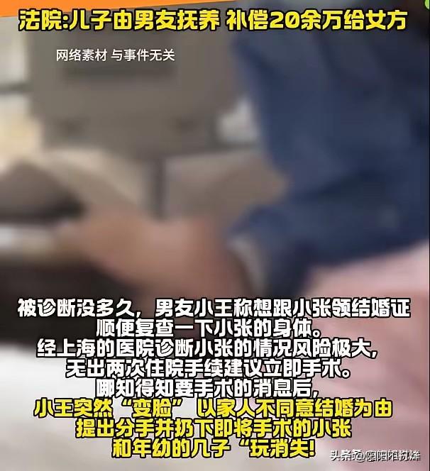 上海,一个快40岁的女人,跟一个00后男生好上了。俩人住到一起后,女的生了个儿子。过了一年,她又怀了,男的还说要跟她结婚。可一查出她怀的位置不对,得马上做手术,男的和他家里人立马变脸,直接玩消失。出院后,女的把男的告了,要求儿子归男方养,还要他赔21万,说自己身体搞坏了,就是因为给这男的怀孩子。 这事发生在上海,女的叫小张,85年的,男的叫小王,00后。俩人2019年认识,很快就同居了。2022年,小张生了个儿子,2023年底又怀了,小王当时还说要去领证,顺便带她去医院检查身体。 结果一查,是子宫角部妊娠,这病很危险,随时可能大出血,医生说必须马上手术。小王一听要手术,直接说家里人不同意结婚,要分手,然后就联系不上了,把要手术的小张和一岁多的儿子扔在那不管。 手术那天,小张一个人躺在病床上,连个签字的人都没有,还是她妈从老家赶过来照顾她。术后,小张身体留下了永久的毛病,干不了重活,后续治疗和恢复都要花钱。 2024年,小张把小王告到法院,要求儿子归小王养,还要他赔21万。小王那边说,俩人没结婚,他没义务赔偿,小张的病跟他没关系。 法院判了:儿子归小王抚养,小张每个月给抚养费,直到孩子18岁,每个月还能看两次孩子;小王要赔小张20多万,扣掉之前给的几千块医药费,实际要给21万多。 法院说,虽然俩人没领证,但小张的身体问题确实是跟小王同居怀孕导致的,小王作为孩子亲爹,在女方病危的时候跑了,太不负责任,必须承担后果。 这事给所有人提了个醒:别想着用孩子绑住感情,不爱你的人,有了孩子照样跑;女的一定要保护好自己的身体,没足够保障前,别轻易怀孕;真遇到这种事,别憋着,直接用法律维权,别让不负责任的人白占便宜。 感情里,别光听甜言蜜语,要看对方遇到事的时候靠不靠谱。小张敢站出来维权,不光是为自己,也是给所有遇人不淑的人提了个醒:该要的公道,一分都不能少。 你觉得这男的做得对吗?要是你遇到这事,会像小张一样起诉吗?