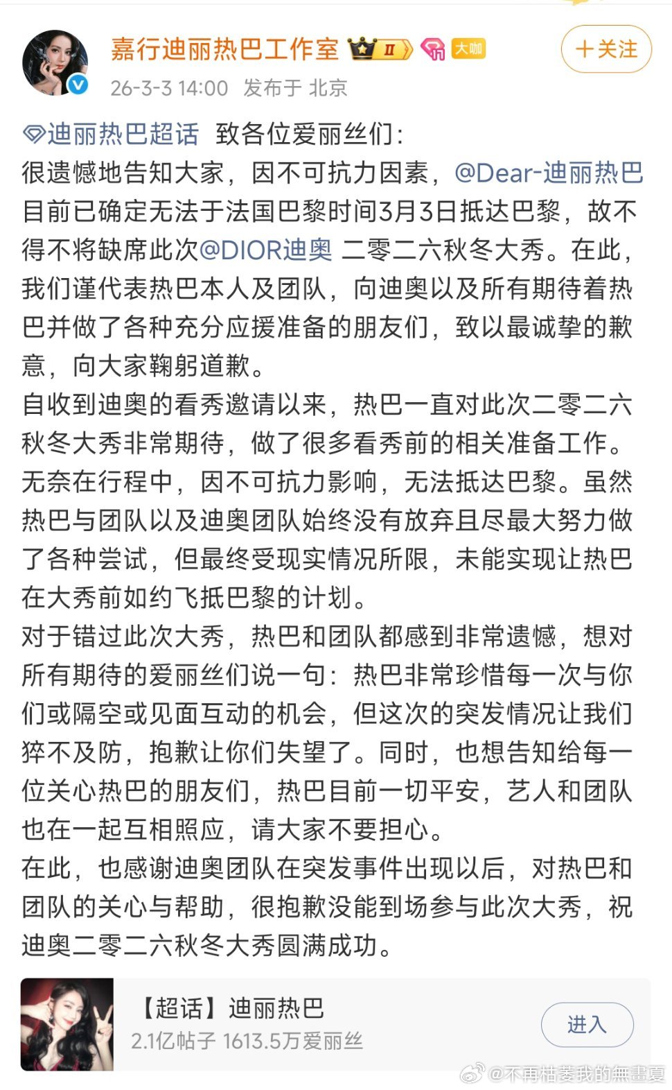 天塌了 迪丽热巴将缺席时装周 女神无法闪耀巴黎了……天杀的嘉行什么事都干不好