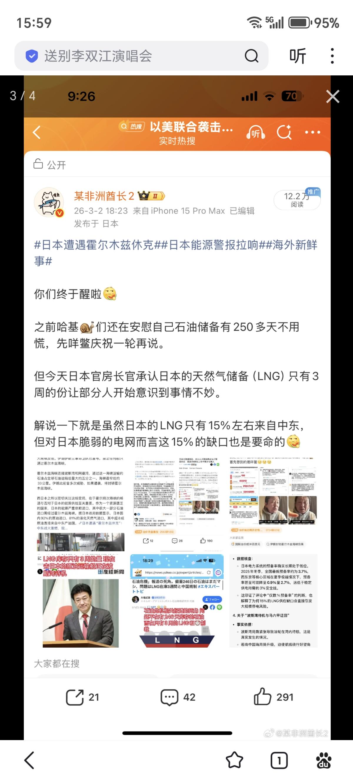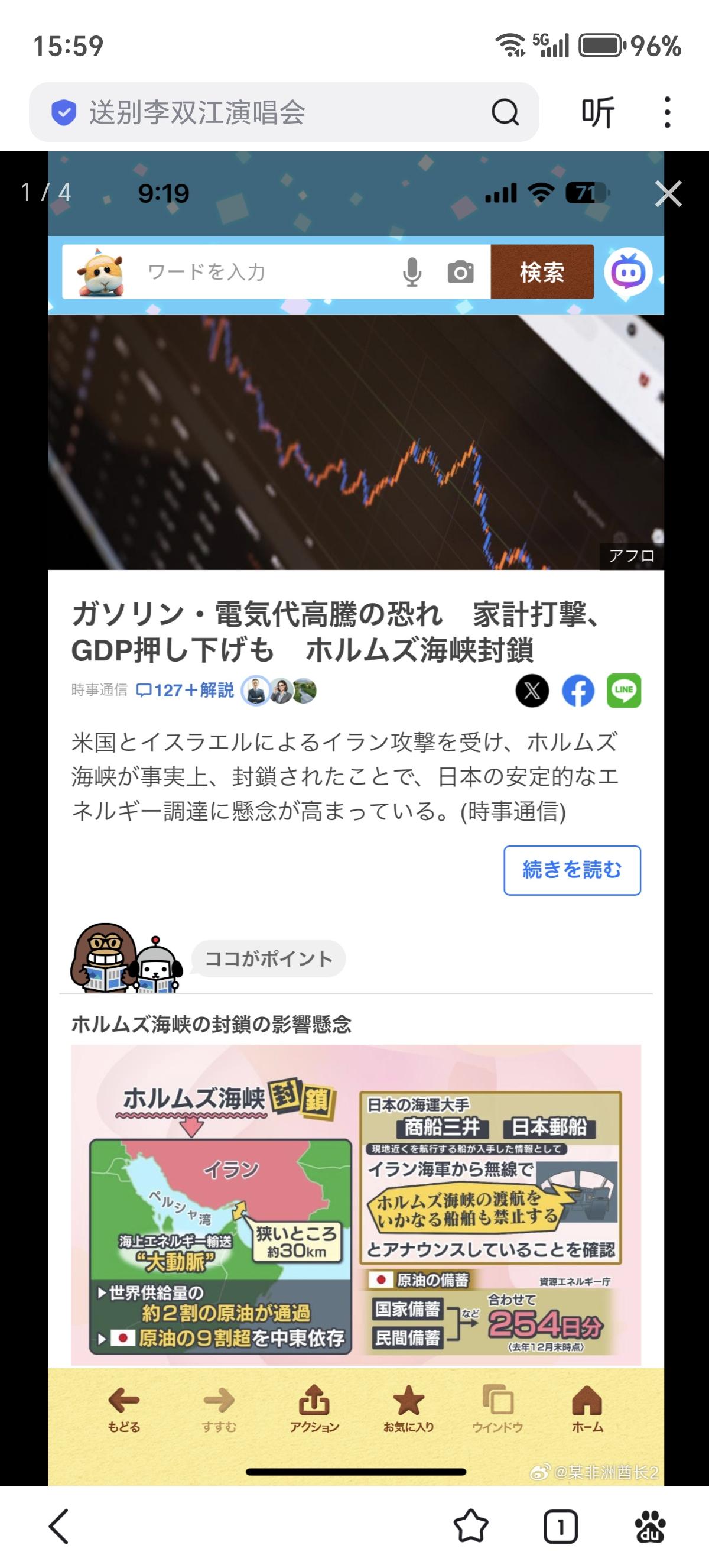今早的雅虎头条,霍尔木兹海峡封锁的相关报道多起来了,现在有43艘日本相关油轮货轮停在波斯湾,三井商船和日本邮船确认到了伊朗方面禁止通行的无线通告警告。 日本政府表示原油储备充足不用担心,各家能源与电力公司表示4月以后才可能出现影响 顺带木有日媒报道⏰船依然能过