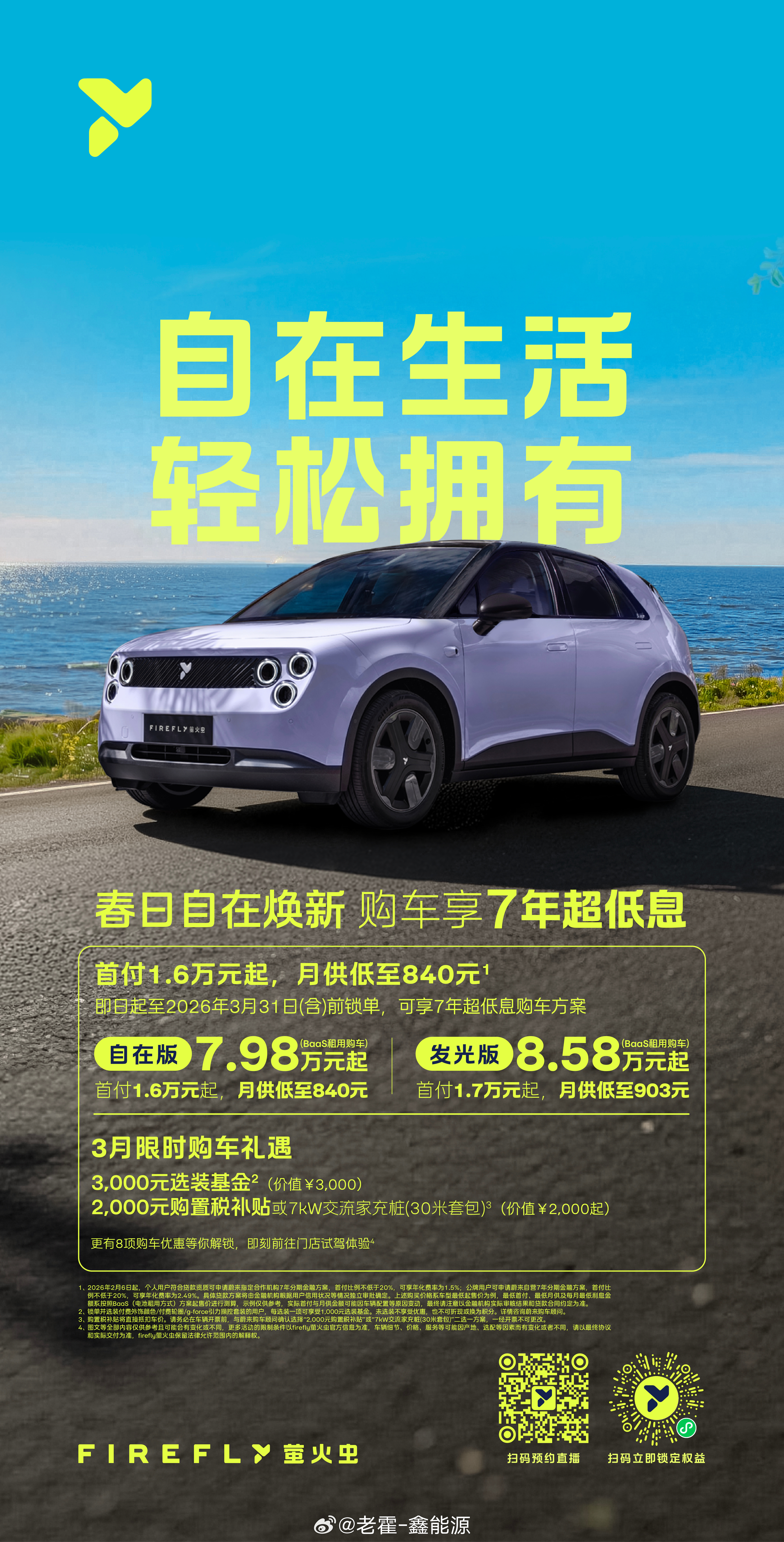 firefly萤火虫3月份购车权益出来了!7年超低息以及千元选装基金来了!甚至还包括2000块的购置税补贴,这个确实还是挺厉害的,这个价位,买到这么一台全球最安全的智能小车,相当不错的。萤火虫最大的特点还是它的个性,我感觉选这个车的人都是很有意思的年轻人,我家楼下就有一台改装了的萤火虫,相当帅气