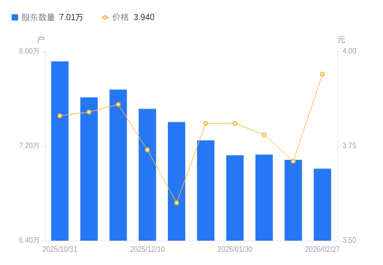 日期A股户数(户)流通A股户均持股数(股)户均持股市值(万元)2026-02-277009522295.678.782026-02-137084222060.578.182026-02-107128221924.398.292026-01-307122621941.638.362026-01-207248121561.718.222025-12-317402321112.567.602025-12-107515120795.667.782025-11-287678620352.867.862025-11-207612420529.857.882025-10-317916619740.987.56