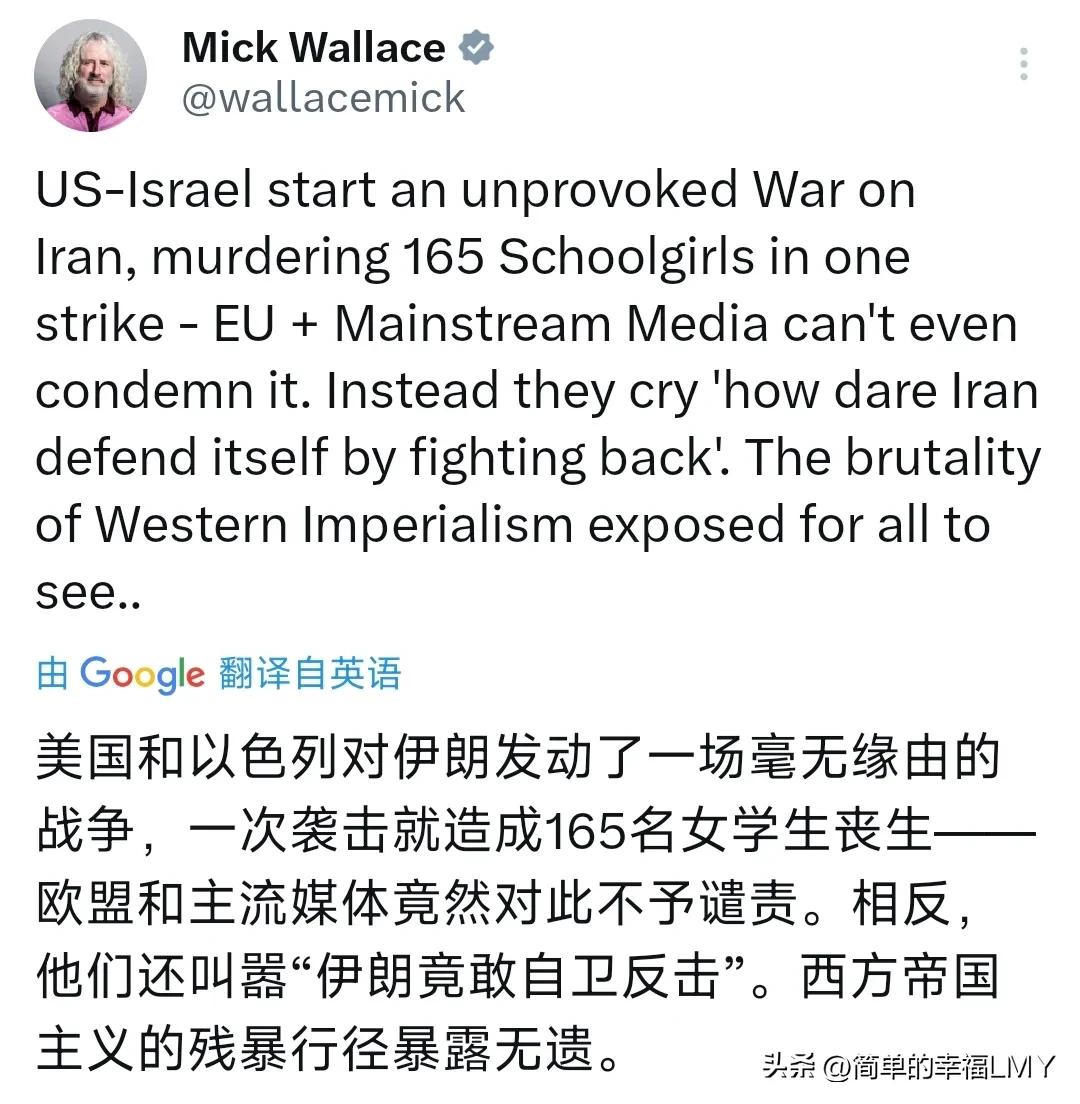 前欧洲议会议员米克·华莱士今天(北京时间3月3日)写道:“美国和以色列对伊朗发动了一场毫无缘由的战争,一次袭击就造成165名女学生丧生欧盟和主流媒体竟然对此不予谴责。相反,他们还叫嚣‘伊朗竟敢自卫反击’。西方帝国主义的残暴行径暴露无遗。” 评几句:在充斥着偏见与利益算计的欧洲议会,华莱士敢为弱者说话,敢揭战争的伤疤,比那些装聋作哑的政客多了太多良知。165名女学生,本是豆蔻年华,该在课堂上读书、在阳光下欢笑,却在美以的导弹下化为灰烬。 这样针对平民的野蛮袭击,西方却喊不出一句谴责,反而对着奋起自卫的伊朗指指点点。 这就是西方嘴里的“人权”?这就是他们标榜的“正义”?双标的嘴脸,此刻比墨还黑。 当炸弹落在伊朗小学的屋顶,当孩子们的书包变成碎片,欧盟的官员们在沉默;当主流媒体忙着渲染“伊朗威胁”,却对165个逝去的生命轻描淡写。他们的“人权”,原来只分肤色、看立场,只护强者、欺弱者。 华莱士戳破的,何止是双标。是西方帝国主义的霸权本质——我可以动手打人,你不能还手;我炸了你的家园,你反抗就是“破坏和平”。这种强盗逻辑,被包装成“国际规则”,骗了世界很多年。可165名女学生的鲜血,洗不掉这种逻辑的肮脏。 伊朗的自卫,本是天经地义。哪国人民面对外敌轰炸、同胞惨死,能坐视不理?可在西方眼里,伊朗的反抗成了“挑衅”,成了“破坏地区稳定”。他们忘了,是谁先动的手,是谁让无辜者流血。这种颠倒黑白的本事,比任何武器都伤人。 欧洲议会里,太多政客被利益捆住了手脚。美国的脸色、以色列的游说,比165个孩子的命更重要。他们忙着附和霸权,忙着算计得失,把良知揣进了口袋。唯有华莱士这样的少数人,敢站出来说句人话。 他的声音不大,却像惊雷,炸醒了那些被蒙蔽的人:看看吧,这就是你们追随的“文明”,这就是你们维护的“秩序”。西方总说自己是“文明灯塔”,可灯塔照不到伊朗小学的废墟;总说要“保护弱者”,可弱者的哭喊传不到他们的耳朵里。 当霸权成了信仰,当利益盖过良知,所谓的“人权”“正义”,不过是用来粉饰侵略的遮羞布。 165名女学生的名字,或许不会被西方媒体记住,但会刻在伊朗人民的心里,刻在世界正义者的心里。 她们的逝去,不是数字,是对西方虚伪的最有力控诉。华莱士的话,让更多人看清:霸权可以一时横行,却骗不了历史;双标可以蒙蔽一时,却遮不住人心。这场战争里,最清醒的是普通民众。 他们看得见谁在施暴,谁在反抗;分得清谁在说谎,谁在说真。西方的沉默,西方的指责,只会让世界更明白:跟着霸权走,只会离正义越来越远;为弱者发声,才是人性该有的温度。 华莱士的勇气,值得敬佩。在满是利益交换的政治场,他守住了良知。而那些沉默的、颠倒黑白的,终会被钉在历史的耻辱柱上。165名女学生的鲜血不会白流,它们会成为镜子,照出谁是真恶魔,谁在装天使。 霸权可以嚣张一时,但正义或许会迟到,绝不会缺席。当世界看清西方的真面目,当越来越多的人像华莱士一样站出来,双标的游戏终将玩不下去。毕竟,人心是秤,能称出谁轻谁重;历史是笔,会写下谁对谁错。