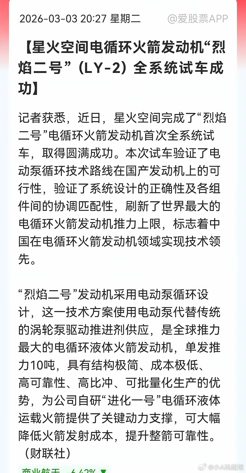快讯!国内商业航天重磅发布!明天板块要大反攻吗?就在刚刚,商业航天板块利好消息重磅出炉,星火空间电循环火箭发动机“烈焰二号”(LY-2)全系统试车成功。最值得关注的是“烈焰二号”发动机采用电动泵循环设计,具有结构极简、成本极低、高可靠性、高比冲、可批量化生产的优势,可大幅降低火箭发射成本,提升整箭可靠性。我们跟Space X的火箭差距就是成本,这次我们的“烈焰二号”发动机已经大幅降低成本了,再等“可回收火箭技术”的成功,我们的火箭发射成本会不会比Space X发射成本还要低呢,这个值得我们深思了。所以此消息必然是大利好我们商业航天板块的,今天板块虽然表现得很差,其实大家也不必失去信心,全场都大跌,这里也大跌,这是影响不了大趋势的,看看明天市场的表现吧,如果市场能够情绪好转,这里还是有一马当先表现的。