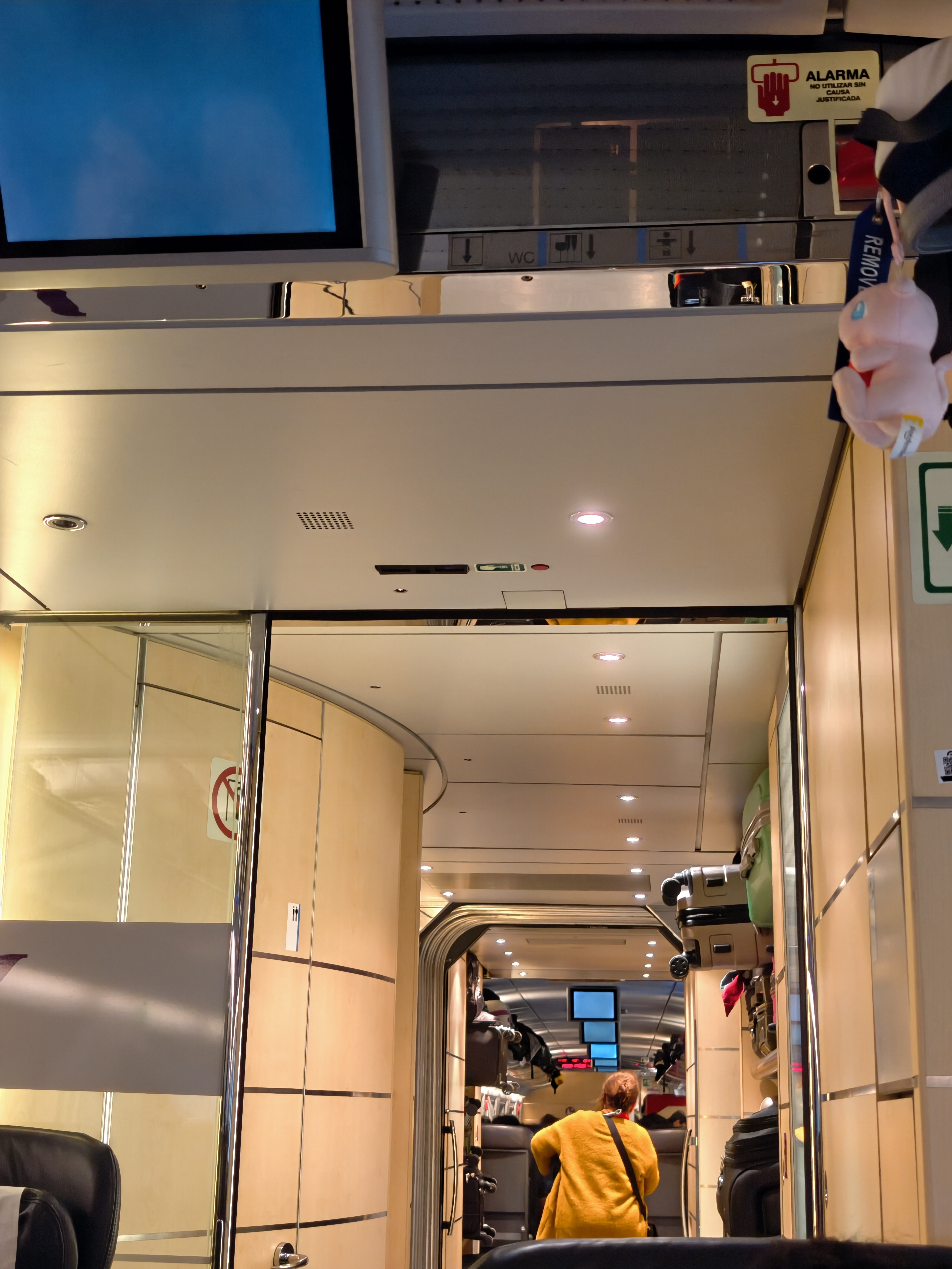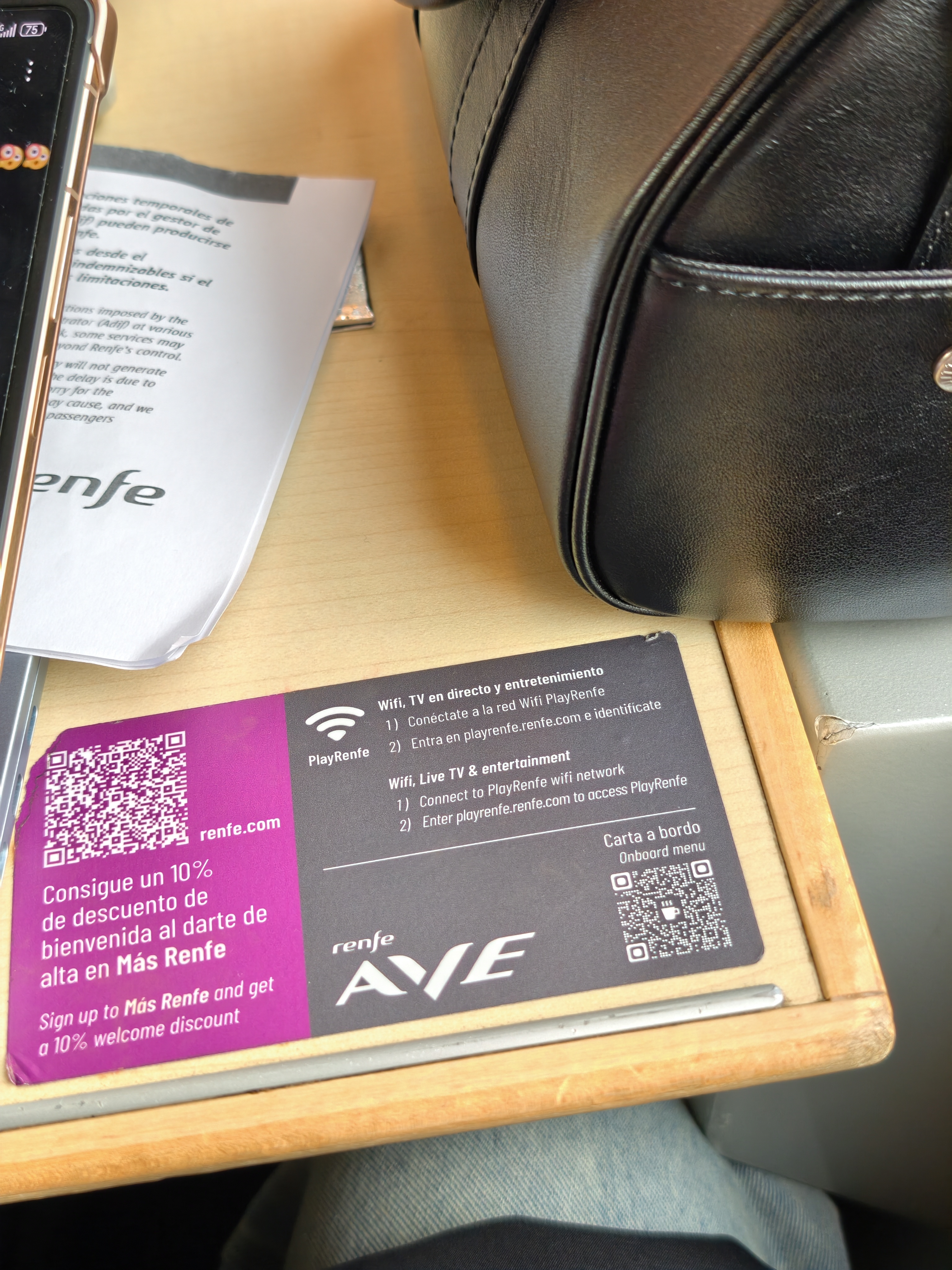 终于到马德里了,这趟巴塞罗那到马德里的高铁,途中最高时速差不多230公里左右,虽然车比较老旧,但是感觉还可以,虽然偶尔车身会倾斜,但是整体体验还不错,全程600公里的路程,要接近3个多小时,车上网络不是很好,虽然也提供了免费WIFI,但是一直连不上,可能是我不太会操作吧,不过我提前下了短剧也算可以放松一下了