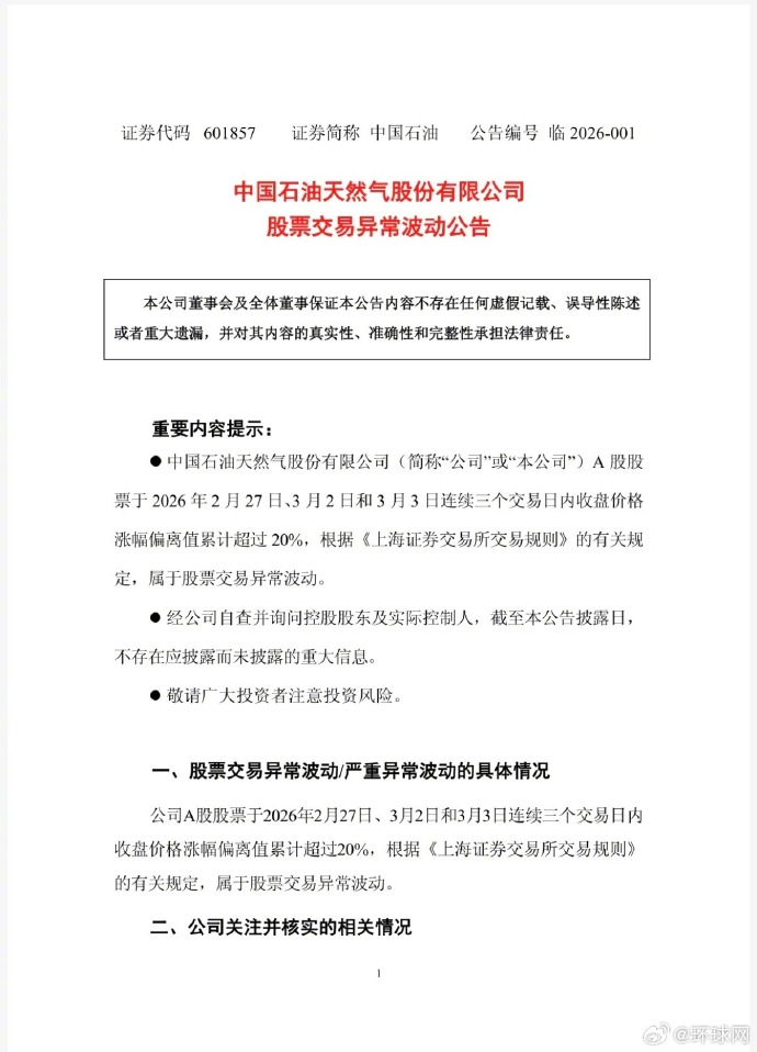 中国石油发布公告称,公司A股股票于2026年2月27日、3月2日和3月3日连续三个交易日内收盘价格涨幅偏离值累计超过20%,属于股票交易异常波动。经自查,公司目前生产经营情况正常,近期行业政策没有发生重大变化。近期国际原油市场受地缘局势、供需格局等多重因素影响,价格呈现宽幅震荡走势,短期油价波动存在较大不确定性,敬请广大投资者注意风险。