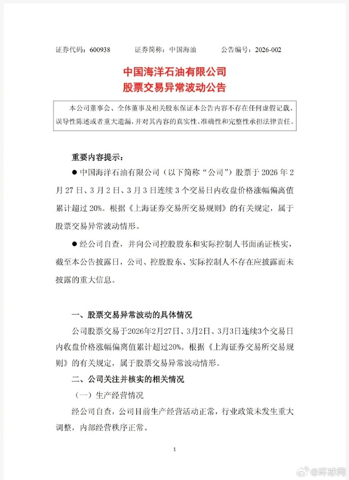 中国海油发布公告称,公司股票连续三个交易日内收盘价格涨幅偏离值累计超过20%,属于股票交易异常波动情形。近期国际原油市场受地缘局势、供需格局等多重因素影响,价格呈现宽幅震荡走势,短期油价波动存在较大不确定性,敬请广大投资者注意风险。