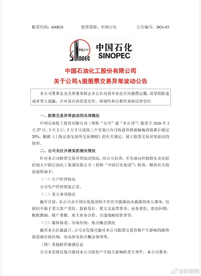 中国石化发布公告称,公司股票于2026年2月27日、3月2日、3月3日连续三个交易日内日收盘价格涨幅偏离值累计超过20%,属于股票交易异常波动情形。经核实,公司生产经营情况正常,公司及控股股东均不存在应披露而未披露的重大事项。受地缘政治等因素影响,国际原油价格走势存在诸多不确定性,敬请广大投资者注意风险。