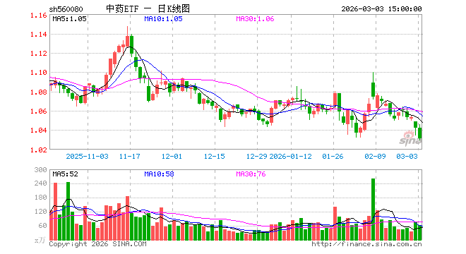 3月3日,中药ETF(560080)跌1.06%,成交额6556.75万元。当日份额增加1250.00万份,最新份额为24.56亿份,近20个交易日份额增加1.33亿份。最新资产净值计算值为25.32亿元。