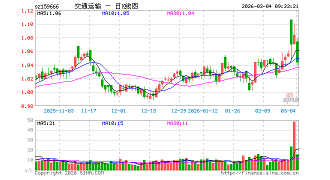 3月4日,交通运输ETF(159666)开盘跌0.83%,报1.074元。交通运输ETF(159666)重仓股方面,京沪高铁开盘跌0.39%,中远海控跌2.77%,顺丰控股跌0.54%,大秦铁路跌0.38%,中国东航跌1.48%,南方航空跌0.88%,上海机场跌0.47%,中国国航跌0.76%,春秋航空跌0.56%,招商轮船跌4.33%。