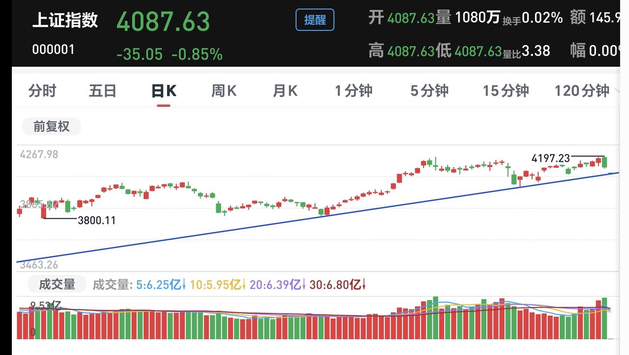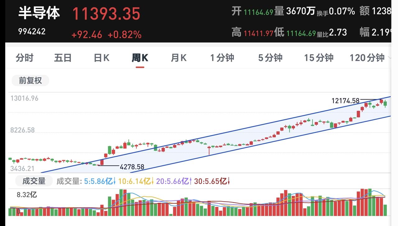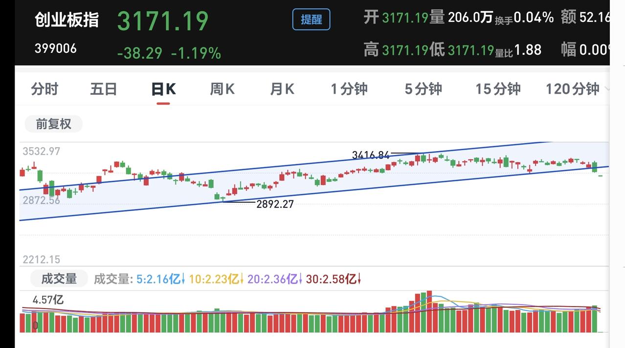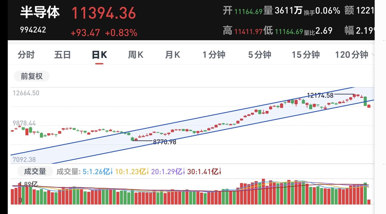基金:半导体板块上涨,是不是已经止跌 今天市场低开,三大指数都是低开,创业板指开盘下跌了1.19%,开于3171点,上证指数开盘下跌了0.85%,开于4087点。 看下面的截图2,这是上证指数日K线图,图中我画了一条倾斜向上的斜线,这是上证指数日线级别上涨趋势线,今天开盘点位就在这条上涨趋势线上,如果继续下跌就会跌破这条上涨趋势线,上证指数日线级别的上涨趋势有可能就会被改变,继续观察今天会不会跌破这条上涨趋势线,持续观察近期会不会跌破这条上涨趋势线。 看下面的截图3,这是创业板指日K线图,图中我画了两条倾斜向上的斜线,这是创业板指日线级别上涨通道,昨天下跌跌破了这个上涨通道的下轨线,今天开盘点位在上涨通道的下方,如果连续三个交易日不能都回到原来的上涨通道内,创业板指的上涨趋势就有可能已经被改变。 开盘以后指数小幅度震荡,黄色线在蓝色线的下方,盘中会有反弹出现,反弹的时候观察两个方面,一个是能不能回补今天开盘时候向下的跳空缺口,一个是有没有资金在反弹的过程中进场,如果这两个任务都不能完成,震荡调整会向纵深发展,如果这两个任务都能完成,这一轮的震荡调整的深度就不会太大。 两市累计成交5104亿,相比于昨天同期缩量了8%,说明到现在为止的过程当中还没有资金进场,上涨2600多家,下跌2500多家,上涨家数超过了下跌家数,涨停14家,跌停27家,跌停家数超过了涨停家数,主力资金净流出206亿。 整个市场主力资金净流入最多的三个板块是:贵金属板块,电网设备板块,保险板块,主力资金净流出最多的三个板块是:国企板块,蓝筹策略板块,esg板块。 持有基金现在盘中估值亏损了2860元,盈利金额最大的三个板块是:芯片半导体板块,先进制造板块,沪港深消费板块,亏损金额最大的三个板块是:白酒板块,证券板块,创新药板块。 看下面的截图11,这是半导体板块日K线图,昨天下跌跌破了日线级别上涨通道的下轨线,今天虽然是上涨,但并没有能够收回到原来的上涨通道内,日线级别现在还是处于破位状态之中,到现在为止的上涨,不能表明这个板块的调整已经结束,也不能表明这个板块已经止跌。 看下面的截图12,这是半导体板块周K线图,现在的位置处于这个上涨通道中,周线级别上涨通道的下轨线是长线持有者的持有条件,如果跌破了周线级别上涨通道的下轨线,长线持有的人也要注意风险。 昨天大跌,今天有反弹的可能性很大,最起码盘中会有反弹,反弹的质量很重要,这关系到这一次调整的深度和时间,盘面情况还需要继续观察。 花1秒钟点赞,花30秒钟评论,就是对我最大的支持,谢谢大家的支持。
