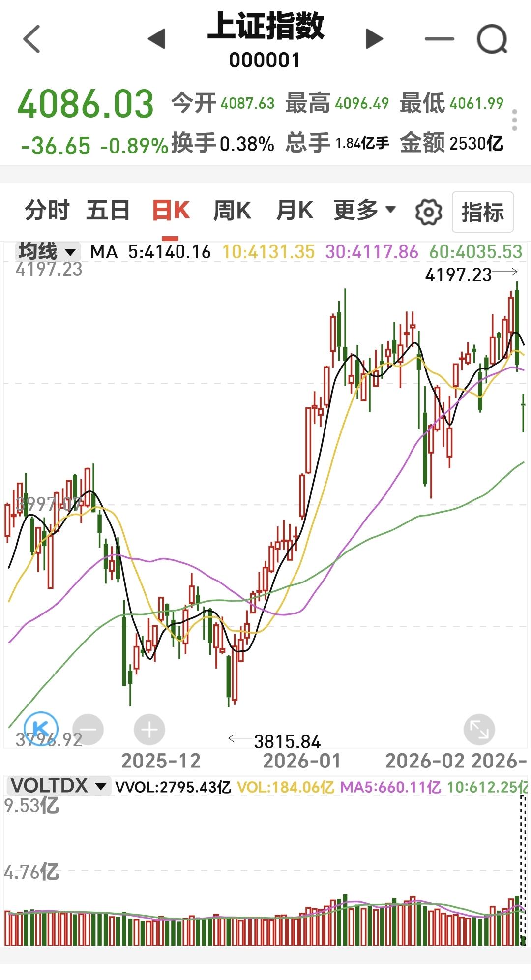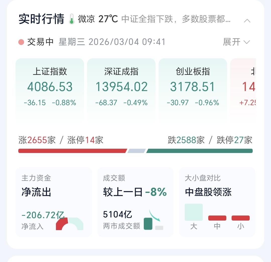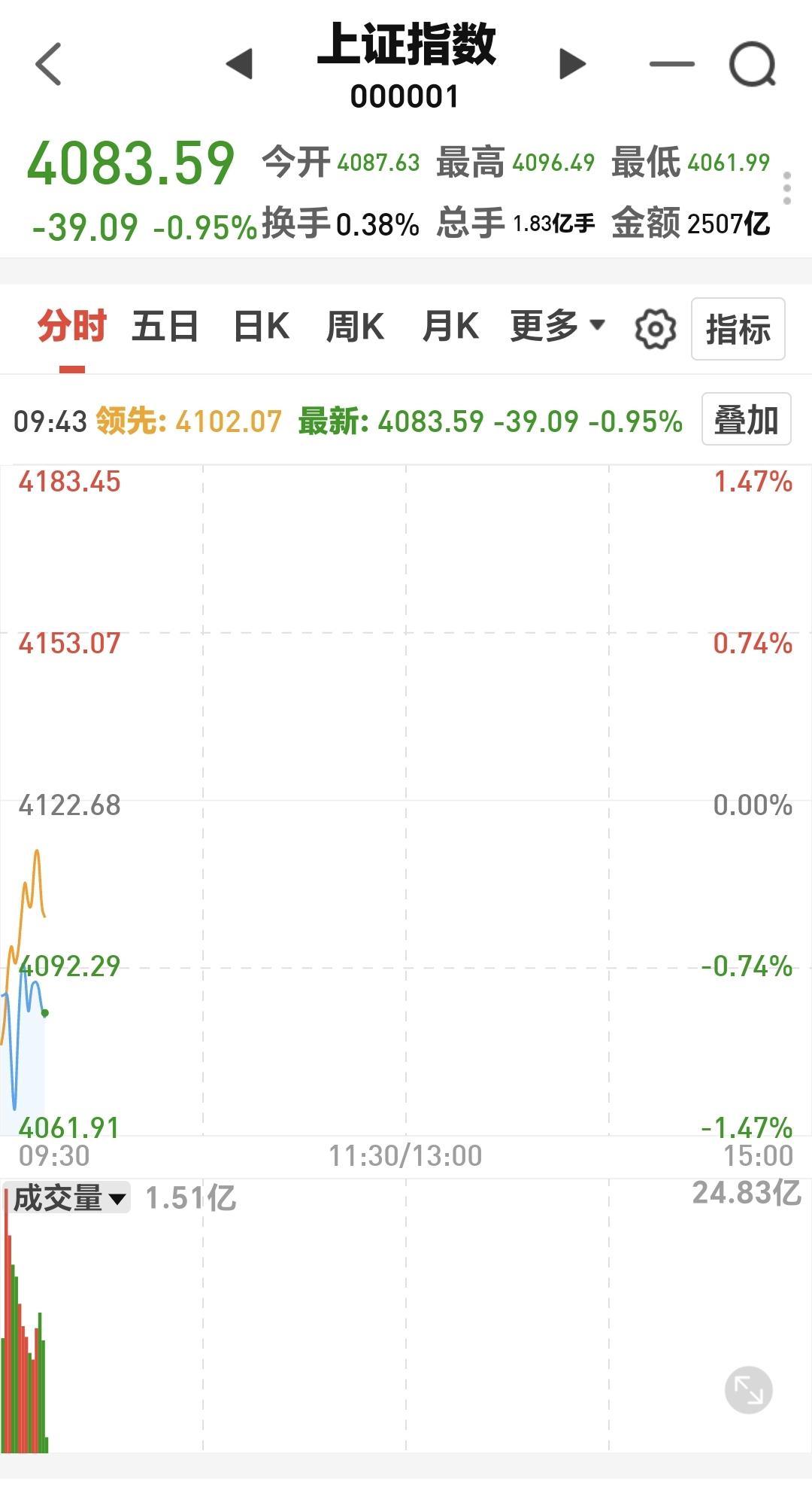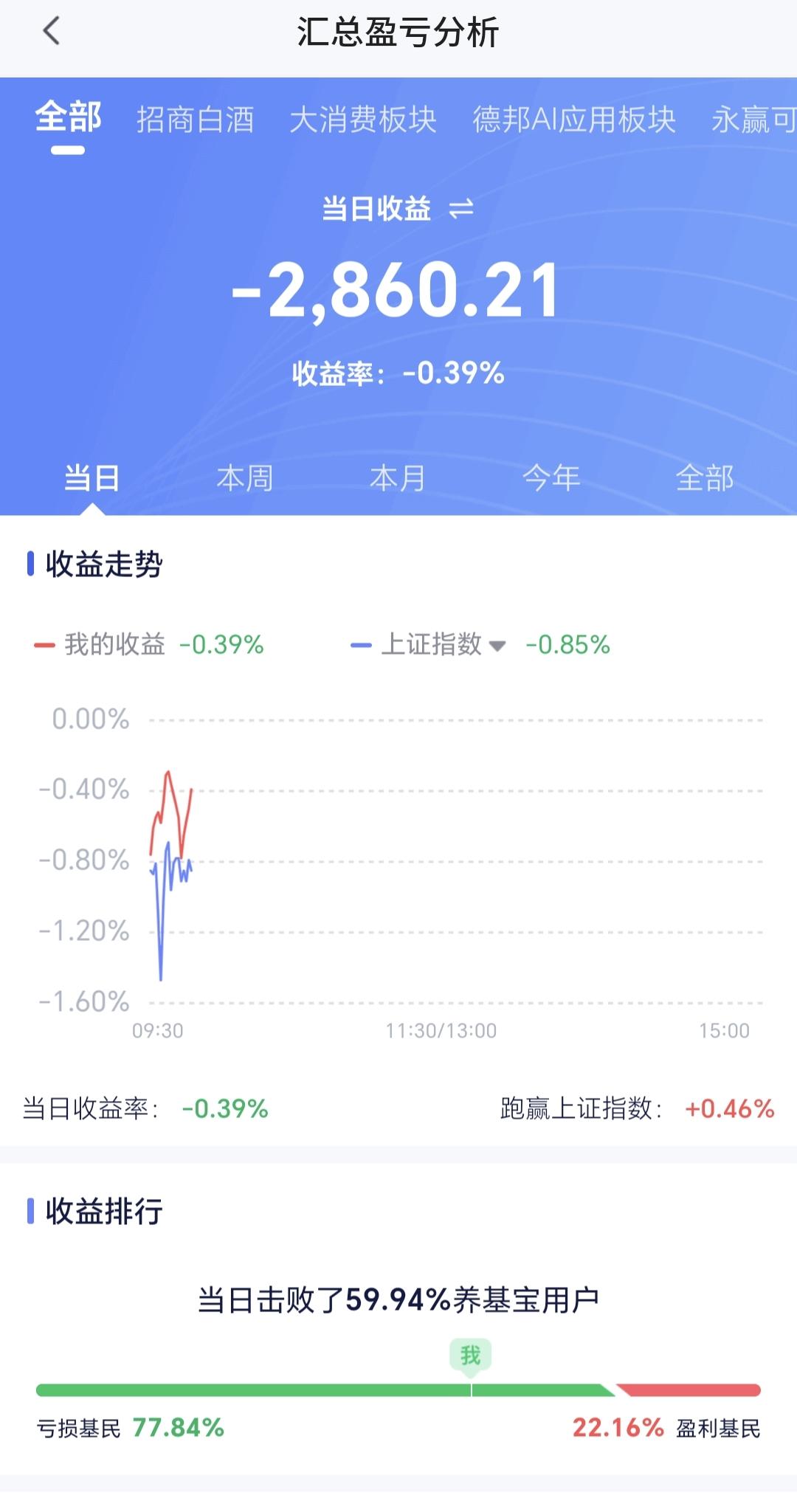 基金:半导体板块上涨,是不是已经止跌 今天市场低开,三大指数都是低开,创业板指开盘下跌了1.19%,开于3171点,上证指数开盘下跌了0.85%,开于4087点。 看下面的截图2,这是上证指数日K线图,图中我画了一条倾斜向上的斜线,这是上证指数日线级别上涨趋势线,今天开盘点位就在这条上涨趋势线上,如果继续下跌就会跌破这条上涨趋势线,上证指数日线级别的上涨趋势有可能就会被改变,继续观察今天会不会跌破这条上涨趋势线,持续观察近期会不会跌破这条上涨趋势线。 看下面的截图3,这是创业板指日K线图,图中我画了两条倾斜向上的斜线,这是创业板指日线级别上涨通道,昨天下跌跌破了这个上涨通道的下轨线,今天开盘点位在上涨通道的下方,如果连续三个交易日不能都回到原来的上涨通道内,创业板指的上涨趋势就有可能已经被改变。 开盘以后指数小幅度震荡,黄色线在蓝色线的下方,盘中会有反弹出现,反弹的时候观察两个方面,一个是能不能回补今天开盘时候向下的跳空缺口,一个是有没有资金在反弹的过程中进场,如果这两个任务都不能完成,震荡调整会向纵深发展,如果这两个任务都能完成,这一轮的震荡调整的深度就不会太大。 两市累计成交5104亿,相比于昨天同期缩量了8%,说明到现在为止的过程当中还没有资金进场,上涨2600多家,下跌2500多家,上涨家数超过了下跌家数,涨停14家,跌停27家,跌停家数超过了涨停家数,主力资金净流出206亿。 整个市场主力资金净流入最多的三个板块是:贵金属板块,电网设备板块,保险板块,主力资金净流出最多的三个板块是:国企板块,蓝筹策略板块,esg板块。 持有基金现在盘中估值亏损了2860元,盈利金额最大的三个板块是:芯片半导体板块,先进制造板块,沪港深消费板块,亏损金额最大的三个板块是:白酒板块,证券板块,创新药板块。 看下面的截图11,这是半导体板块日K线图,昨天下跌跌破了日线级别上涨通道的下轨线,今天虽然是上涨,但并没有能够收回到原来的上涨通道内,日线级别现在还是处于破位状态之中,到现在为止的上涨,不能表明这个板块的调整已经结束,也不能表明这个板块已经止跌。 看下面的截图12,这是半导体板块周K线图,现在的位置处于这个上涨通道中,周线级别上涨通道的下轨线是长线持有者的持有条件,如果跌破了周线级别上涨通道的下轨线,长线持有的人也要注意风险。 昨天大跌,今天有反弹的可能性很大,最起码盘中会有反弹,反弹的质量很重要,这关系到这一次调整的深度和时间,盘面情况还需要继续观察。 花1秒钟点赞,花30秒钟评论,就是对我最大的支持,谢谢大家的支持。
