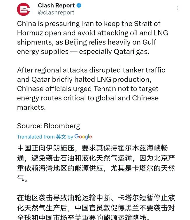美媒称,中国正在对伊朗进行施压!3月3日,美国彭博社声称,中国正在向伊朗施压,要求其保持霍尔木兹海峡的畅通,避免袭击石油和液化天然气运输,因为中国严重依赖海湾地区的能源供应——尤其是卡塔尔的天然气。美媒表示,在地区性袭击扰乱油轮交通、卡塔尔短暂停止液化天然气生产之后,中国官员敦促德黑兰不要把对全球和中国市场至关重要的能源路线作为攻击目标。 说白了,美媒彭博社的炒作,表面看是在报道中国的能源关切,实则是刻意歪曲中国立场、挑拨中伊关系的舆论操作,把中国劝和促谈的大国担当,扭曲成只为自身利益的“施压者”。 要知道,这可不是客观的新闻报道,而是美媒精心设计的叙事陷阱。彭博社刻意截取“中国依赖海湾能源”这一点,把中国维护国际航道安全的正当诉求,包装成“对伊朗施压”的利己行为,只字不提中国立场的核心——敦促所有相关方停火止战、维护全球共同利益。中国作为全球最大能源进口国之一,霍尔木兹海峡关乎全球供应链稳定,中方关注航道安全天经地义。 可这绝非单纯的媒体误读,而是戳破了美媒的双重标准与舆论算计。美媒一边渲染伊朗“封锁海峡”的威胁,一边无视美以率先发动军事打击、才是局势失控的根源;一边把中国劝和说成“施压伊朗”,一边对美国在中东的军事集结、拱火递刀视而不见。其真实目的,就是把中国拖入舆论漩涡,离间中伊战略互信,让中国在中东冲突中被迫选边站,从而削弱中国劝和促谈的影响力。 而中国的真实立场,更是基于铁一般的事实与原则。3月3日外交部明确回应:能源安全关乎世界经济,各方都有责任维护航道畅通;中方敦促各方立即停止军事行动,避免紧张升级,维护霍尔木兹海峡安全。这一表态,既没有承认“施压”,也没有针对伊朗,而是站在全球共同利益的高度,要求所有冲突方停火——包括美以,也包括伊朗。中国始终坚持不选边、不拱火,只劝和、促稳定,这与美媒刻意塑造的“利己施压者”形象,完全是两码事。 更关键的是,这种炒作狠狠暴露了美媒的霸权叙事逻辑。在美媒眼里,大国关注自身能源安全就是“施压”,美国在中东部署重兵、发动打击就是“维护秩序”;中国呼吁停火就是“逼伊朗让步”,美国纵容以色列扩张就是“支持盟友”。这种双重标准,本质是把国际规则当成自家工具,把全球公共议题当成地缘博弈筹码,容不得其他大国秉持公正立场、推动和平解决。 说实话,这也是中国在中东面临的舆论困境。一边要应对美以军事行动引发的地区动荡,一边要警惕美媒的舆论挑拨;一边要维护自身能源安全与海外公民利益,一边要坚守劝和促谈的大国责任。中伊是全面战略伙伴,中方始终尊重伊朗主权与安全关切,也始终反对任何破坏地区和平的行为,所谓“中国施压伊朗”,不过是美媒制造的虚假叙事。 要清楚,霍尔木兹海峡的危机,根源在美以的军事打击,而非伊朗的反制。中国的核心诉求从来不是“逼伊朗开放海峡”,而是让所有冲突方停火止战,从根源上消除航道威胁。只有美以停止军事行动,地区局势降温,海峡才能真正恢复畅通,这才是解决问题的根本,而非单方面要求某一方让步。 而未来,美媒的舆论炒作只会愈演愈烈。随着中东冲突外溢、能源市场震荡,美媒会不断放大“中国施压”的叙事,试图绑架中国立场、干扰中国外交。但中国不会被舆论裹挟,将继续秉持客观公正,推动各方通过对话协商化解分歧,既维护自身能源安全,也守护地区和平稳定,用实际行动打破美媒的虚假叙事。 说到底,美媒炒作“中国向伊朗施压”,本质是一场舆论战,是霸权国家对中国公正立场的抹黑与围堵。中国在霍尔木兹海峡问题上的立场,从来不是“利己施压”,而是维护全球共同利益、推动和平解决危机。真相不会被舆论扭曲,公道自在人心,中国劝和促谈的大国担当,终将得到国际社会的广泛认可。 以上是小编个人看法,如果您也认同,麻烦点赞支持!有更好的见解也欢迎在评论区留言,方便大家一同探讨。