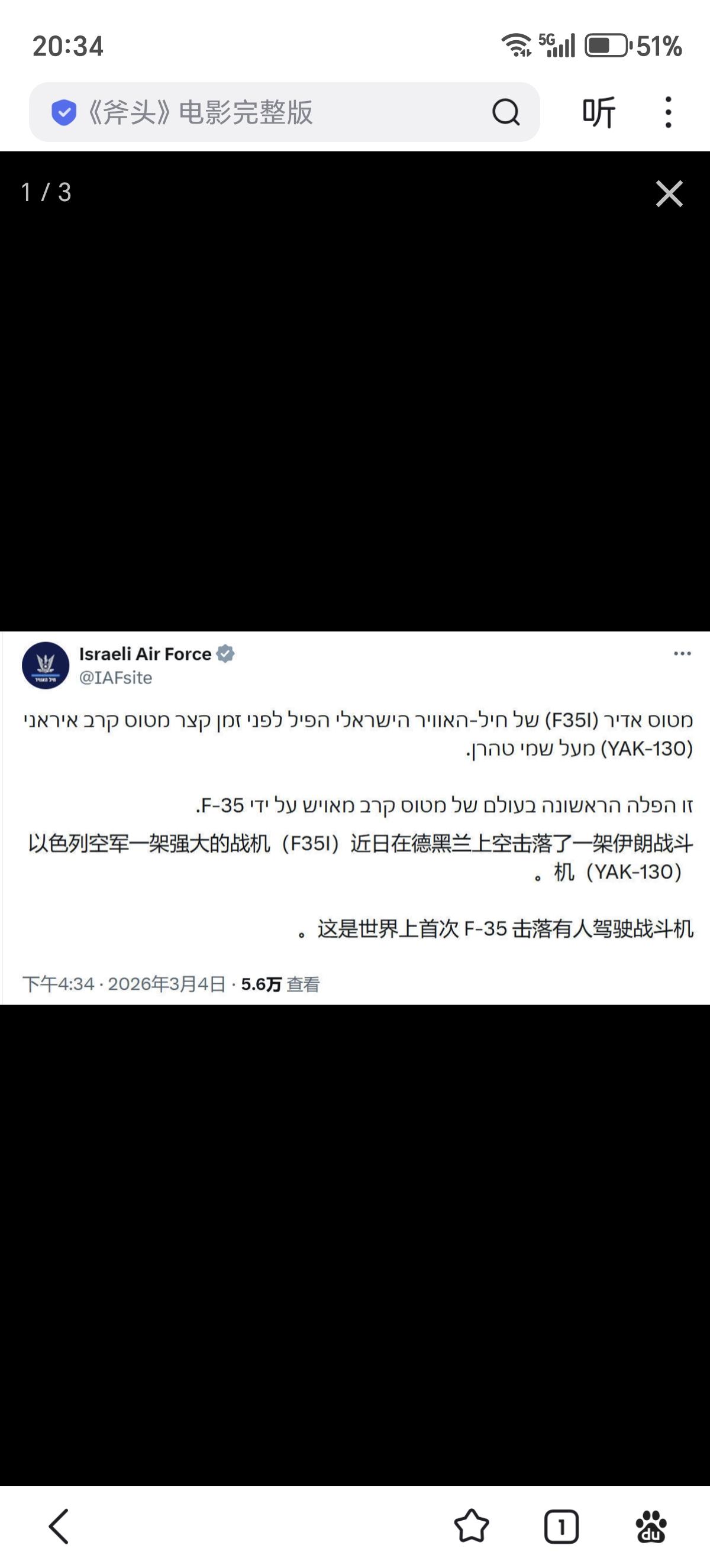 以色列空军在社交媒体上宣布:以军F-35I战斗机在德黑兰上空击落了一架伊朗空军的雅克-130教练机。 然后嘚瑟的写道,这是世界上首次F-35击落有人驾驶战机! 伊朗空军真是被逼急眼了,连压箱底的雅克130教练机,都派出去玩空战保卫德黑兰。 没办法,现在伊朗空军已经没什么飞机能用! 不过,真不知道以色列有啥好得瑟的,大人打小孩还得意洋洋,F-35I击落雅克-130也纯属是欺负人,毕竟差距那么多。