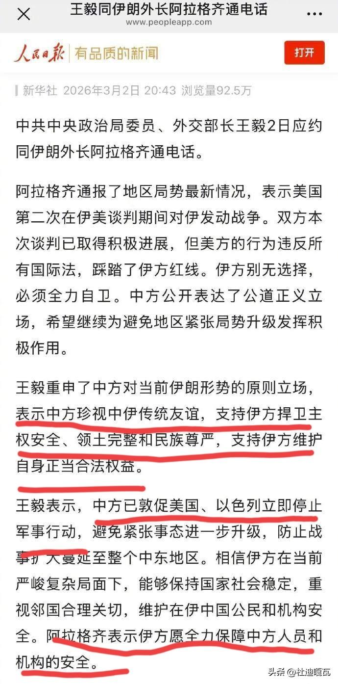 外长的这句弦外之音,伊朗似乎也完全弄懂了, 外长和阿拉格齐在通话中明确表示,中方支持伊朗捍卫主权安全,支持伊朗维护合法权益,而伊朗外长阿拉格奇也表示,要保护中方在伊朗的机构和人员安全。 这次通话双方都直奔主题,开门见山,没有那么多的弯弯绕,就是把话挑明了直说,而伊朗方面也心领神会,继续对周边美军事基地以及以色列的军事目标进行导弹和无人机轰炸。 当前的形势,伊朗别无选择,必须全力以赴,才能捍卫自己的民族尊严!