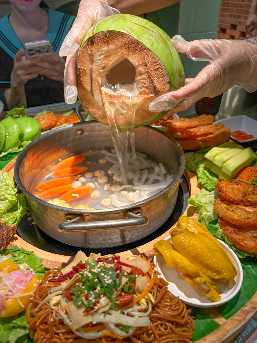 来三亚怎能不吃椰子鸡?今天住在亚龙湾,找到一家在亚龙湾东榕美食广场里的椰小鸡,这家店上了2025必吃榜,肯定不错。 店门口就有可爱的卡通小鸡形象,热情的服务招待我们。这家椰子鸡还有海南大转盘,里面含虾饼、椰子饭、菠萝蜜糯米饭、鸡翅、海南粉、斑斓糕等12种美食。可以边吃鲜嫩椰子鸡,边品尝那么多美食。 火锅锅底就是3只椰子的椰子水,放入文昌鸡煮5分钟就能吃。细嫩的鸡肉带有鲜甜味,特别好吃,不蘸调料也好吃。露露喜欢牛肉,原切肥牛肥而不腻,烫几秒入口那叫一个满足。再配满杯芭乐和暴打柠檬茶吃的真爽。