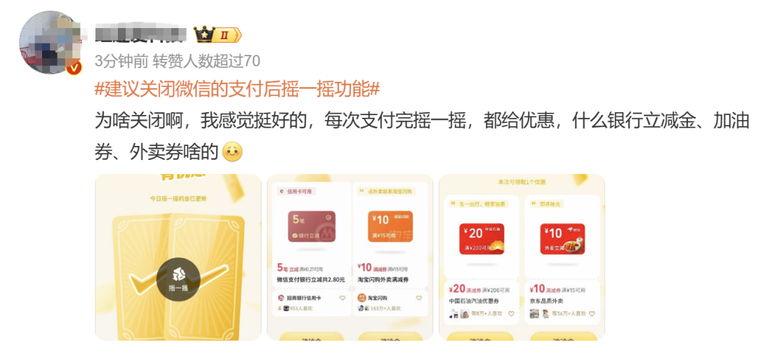 不过,针对这位博主关于微信支付后摇一摇“太灵敏、全是广告、容易误触,甚至可能泄露隐私或诱导老人被骗”的观点,许多网友持反对意见,认为这个功能可以领取银行立减金、话费券、加油券、外卖优惠券等,是实实在在的“羊毛”,为什么要关闭?