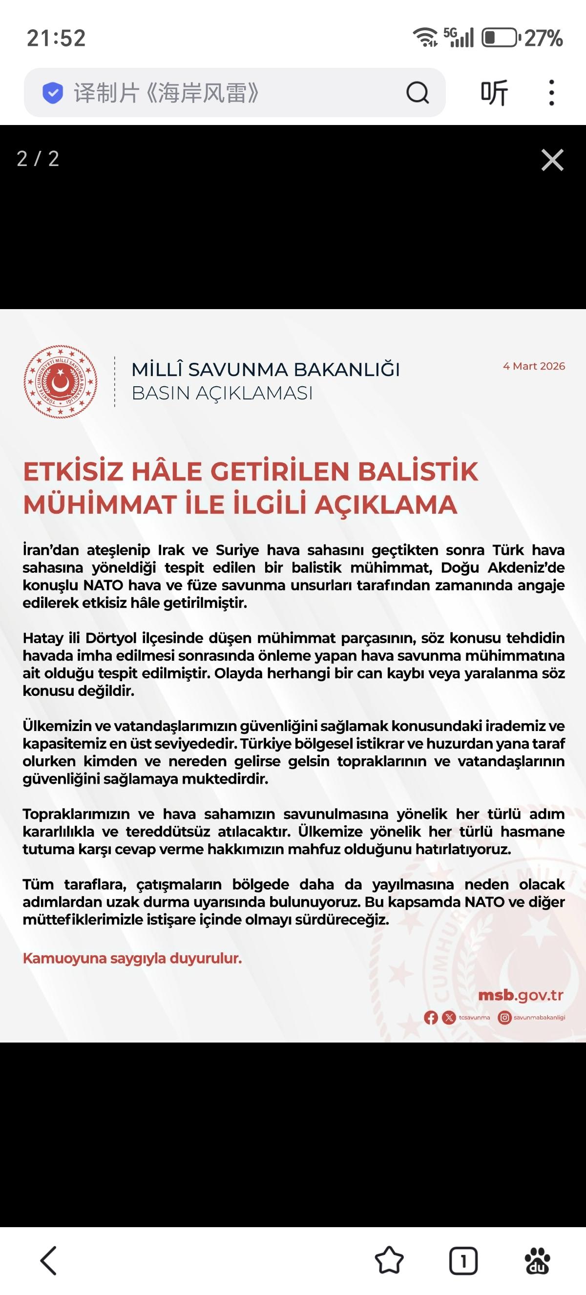 土耳其国防部发文称,一枚从伊朗发射的弹道导弹穿越伊拉克和叙利亚领空,飞向土耳其领空,被部署在东地中海的北约防空导弹部队及时成功拦截。 同时表示,土耳其将毫不犹豫地采取一切必要措施捍卫领土和领空,保留对任何针对我国的敌对行为作出回应的权利,并警告各方避免采取任何可能进一步加剧地区冲突的行动。