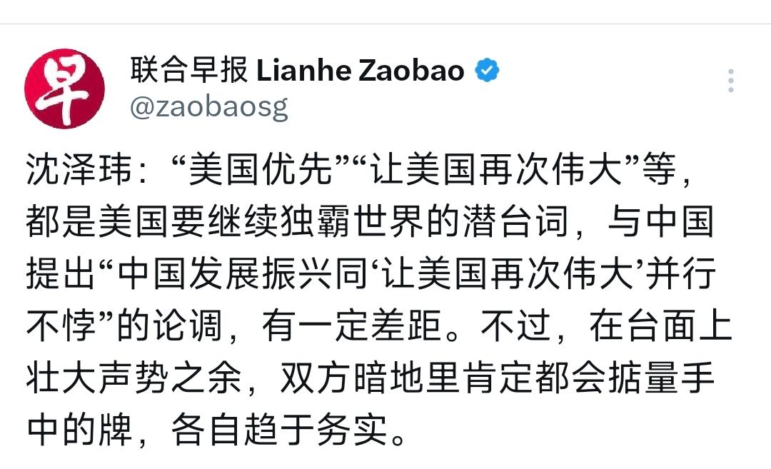 新加坡联合早报今天(3月5日)发表沈泽玮的评论:《一山不能藏二虎?》。“美国优先”“让美国再次伟大”等,都是美国要继续独霸世界的潜台词,与中国提出“中国发展振兴同‘让美国再次伟大’并行不悖”的论调,有一定差距。不过,在台面上壮大声势之余,双方暗地里肯定都会掂量手中的牌,各自趋于务实。 [机智]评几句:新加坡联合早报这篇评论看似中立,实则是对中美博弈本质的轻描淡写。美国“优先”与“再次伟大”的潜台词从来都是独霸世界的霸权宣言,其背后是动辄制裁、军事威慑的单边行径,而中国提出的理念,是基于相互尊重、互利共赢的国际秩序主张,二者本质是霸权逻辑与平等发展理念的根本对立,绝非简单的“差距”可言。所谓双方“暗地里务实掂量”,更是忽视了美国为维系霸权不断对华设限、制造对抗的现实,台面上的声势本就是美国主动挑起,中国的务实从来都是守底线、谋发展,而非与霸权妥协,这样的解读实则模糊了中美博弈的核心矛盾,沦为和稀泥的平庸之论。