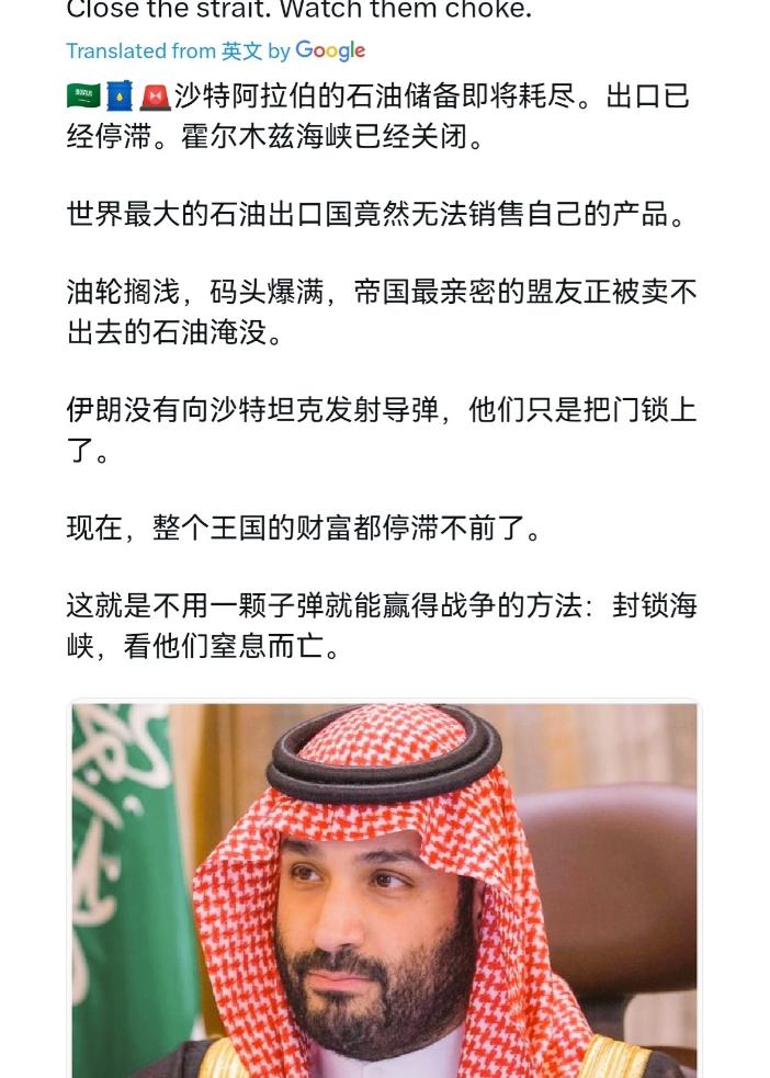 伊朗这一招还是蛮有效的!沙特也被逼到不得不做选择的时候了!3月4日,外媒报道称,沙特阿拉伯的石油存储余量即将耗尽。现在沙特的石油出口已经停滞,霍尔木兹海峡关闭,世界上最大的石油出口国无法运输自己的产品,油轮被困,终端已满,这个国家被卖不出去的石油淹没了。 说白了,伊朗封锁霍尔木兹海峡这一招,直接把沙特逼到了生死抉择的悬崖边,表面是石油运不出去,实则是掐断了沙特的经济命脉,让这个中东能源霸主瞬间陷入前所未有的绝境。 要知道,这可不是普通的航运受阻,而是伊朗精准打击沙特命门的致命一击。3月4日外媒确认,沙特最大石油终端朱艾马储油空间即将耗尽,拉斯塔努拉炼油厂储罐已装满四成,全球最大石油出口国彻底陷入“有油卖不出、有罐装不下”的死局。霍尔木兹海峡被封,全球25%-30%的石油贸易通道瘫痪,150多艘油轮被困波斯湾,沙特日均千万桶的出口完全停滞,石油库存以肉眼可见的速度填满,再拖下去只能被迫全面减产,这对高度依赖石油收入的沙特来说,就是灭顶之灾。 可这绝非单纯的能源封锁,而是戳破了沙特依附美国的脆弱本质。沙特一直把美国当安全靠山,跟着美国围堵伊朗,却没算到伊朗会直接锁死自己的出海通道。美国忙着给军工企业下死命令补弹药,根本顾不上沙特的石油危机,所谓的安全承诺在现实利益面前一文不值。沙特现在才明白,自己成了美国对抗伊朗的棋子,棋子的命运,从来都由不得自己。 而沙特被逼到绝境,更是基于铁一般的现实困境。沙特虽有红海延布港和跨半岛管道,但日运力仅500万桶,远不及霍尔木兹海峡的千万级规模,且红海航道同样面临胡塞武装威胁,根本无法替代主通道。国内储油设施容量有限,生产端一旦停摆,不仅经济崩溃,国内稳定、地区影响力都会瞬间崩塌。一边是伊朗的强硬封锁,一边是美国的靠不住,沙特没有任何退路,只能在妥协与硬扛之间做选择。 更关键的是,这一招狠狠打脸了沙特“中东霸主”的虚假光环。沙特坐拥全球顶级石油资源,却连自己的能源安全都保障不了,被伊朗一招就打回原形。所谓的军事联盟、安全部署,在伊朗的非对称打击面前不堪一击。伊朗用实际行动证明,在中东博弈中,谁掌握战略通道,谁就掌握主动权,沙特空有财富,却没有掌控自己命运的能力。 说实话,这也是中东地缘格局的重大转折点。伊朗不费一兵一卒,仅靠封锁海峡就让沙特屈服,打破了美国主导的中东秩序。沙特现在必须选:要么继续跟着美国硬扛,承受经济崩溃、国内动荡的代价;要么转向与伊朗缓和,重新规划地区关系,保住自己的核心利益。这道选择题,没有中间路线,每一步都关乎国运。 要清楚,能源就是中东的生命线,通道就是国家的命门。伊朗精准抓住沙特的软肋,用最小代价实现最大战略效果,这是顶级的地缘博弈智慧。沙特的困境,是所有依附大国、放弃自主战略的国家的必然结局,没有独立的安全与通道掌控权,再富有也只是待宰的羔羊。 而未来,沙特的选择将直接决定中东局势走向。若沙特妥协,与伊朗达成和解,美国在中东的影响力将大幅衰退,地区格局重新洗牌;若沙特硬扛,只会被持续消耗,最终沦为美国的弃子。关键转折点,就在沙特是否认清现实,放弃对美国的幻想,做出符合自身利益的选择。 说到底,伊朗封锁霍尔木兹海峡,是一招精准致命的战略妙棋,直接把沙特逼到墙角,让其在依附美国与自主求生之间做出抉择。这不仅是能源博弈,更是中东权力格局的重塑,伊朗用实力证明,在这场博弈中,谁更清醒、更懂战略,谁就能掌握主动权。 以上是小编个人看法,如果您也认同,麻烦点赞支持!有更好的见解也欢迎在评论区留言,方便大家一同探讨。