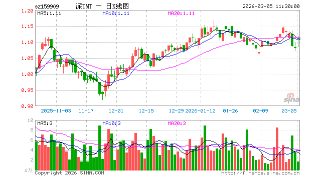 3月5日,截止午间收盘,TMT50ETF招商(159909)涨2.59%,报1.108元,成交额187.10万元。TMT50ETF招商(159909)重仓股方面,中际旭创截止午盘涨6.39%,新易盛涨11.75%,立讯精密涨2.48%,北方华创涨3.90%,胜宏科技涨1.77%,京东方A涨3.47%,中兴通讯涨3.14%,海康威视涨1.88%,东山精密跌1.23%,沪电股份涨1.79%。