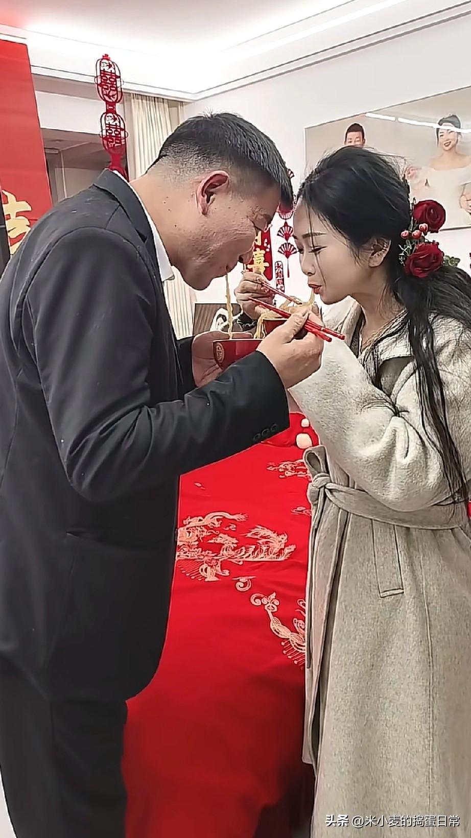 有钱就能娶小30岁? 今天刷到一段婚礼视频,直接给我看懵了。 新房里大红喜被铺得喜庆,墙上贴着“吾家有喜”,穿西装的大叔正用红筷子喂年轻姑娘吃面,姑娘也笑着回喂,画面看着挺温馨。 可评论区直接炸了锅:“年龄差得30岁吧?”“哪里的习俗?结婚要和爸爸一起吃面?”“大叔也想要这样的小媳妇儿,估计今生没机会了”,还有人直接吐槽:“有钱人就是不一样,男人都喜欢18的”。 其实这是当地的“改口面”习俗,大叔是新郎,姑娘是新娘,只是两人年龄差距确实大,才让大家误会了。 有人说这是“特别的缘分”,也有人说“看着像父女,太别扭了”。婚姻如人饮水,冷暖自知,可当年龄差和财富挂钩时,总免不了被世俗指指点点。你们怎么看这种年龄差距大的婚姻?
