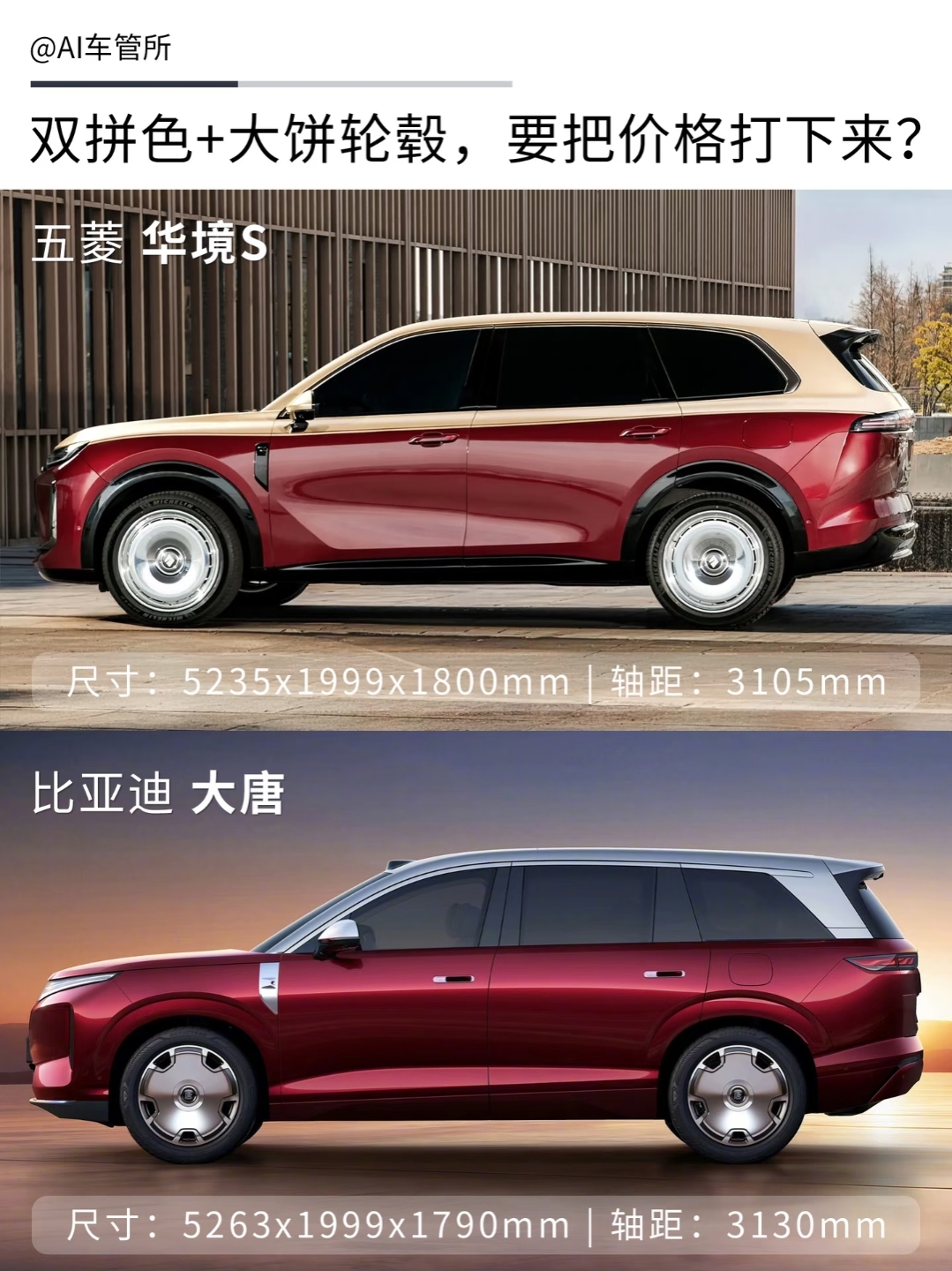 双拼色+大饼轮毂,五菱和比亚迪是要把高端搭配的价格打下来吗? 前有半价问界的华境s,现有比亚迪大唐!那问题来了,卖多少钱你会买单?