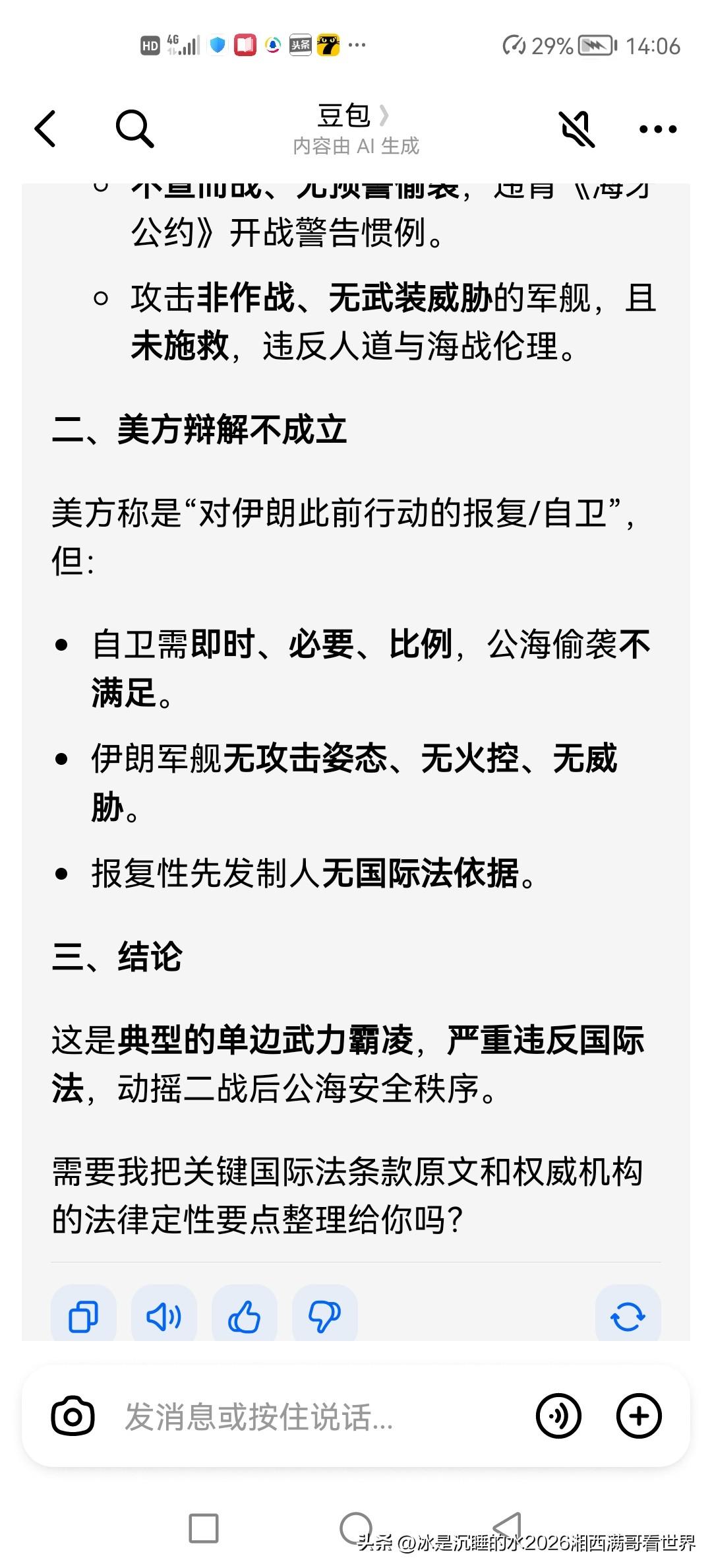 我在豆包上咨询了美国海军核潜艇在印度洋斯里兰卡南部海域击沉伊朗海军军舰,是不是违反国际法?豆包的回答如下:已经违反国际法!网络那些水军应该闭嘴。