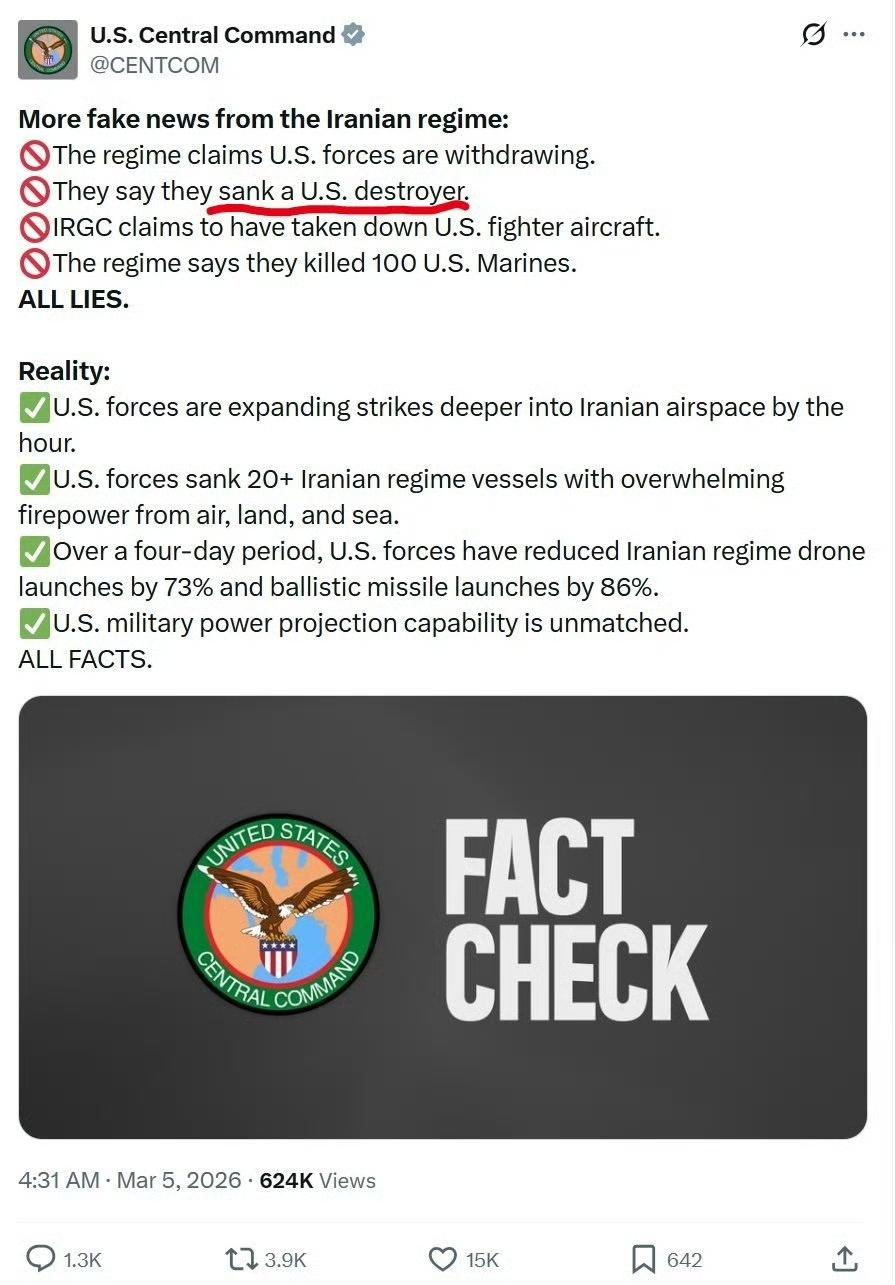 图1是疑似伯克驱逐舰被波斯导弹击中起火的卫星图,标注2026年3月3日热成像检测,称M军阿利·伯克级驱逐舰甲板起火,意在证明导弹成功命中(Hit),打破M军防御神话。 图2、3是M国中央司令部的官方辟谣,红圈重点否定单词是“Sank(击沉)”,宣称其为“谎言”,并罗列M军“打击成果”。 关键逻辑:M军仅否认“舰艇沉没”这一最坏结果,刻意回避否认“中弹起火”。这是典型的技术性否认——既不承认损伤丢面子,也不承认未击沉反而示弱。 真相:驱逐舰大概率确实中弹起火,但未沉没。双方各取所需:波斯宣示打击能力,M国维护霸权尊严,这场冲突本质是战场与舆论场的双重较量。