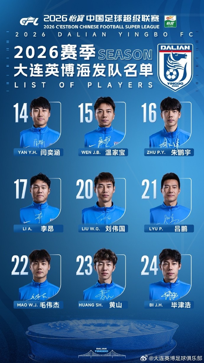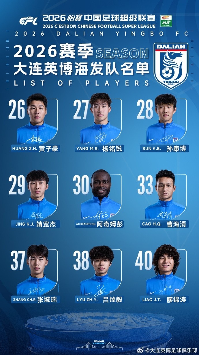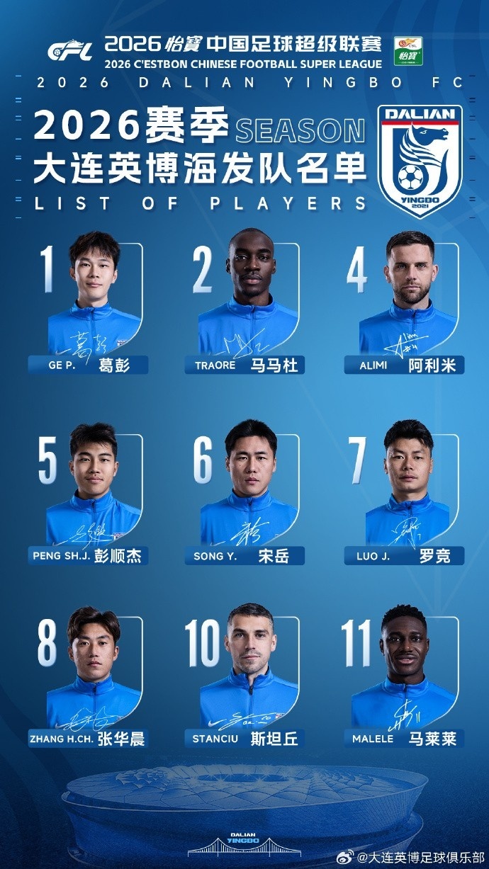 新赛季中超明天拉开帷幕,大连英博官宣新赛季一线队名单,斯坦丘10号、马莱莱11号、朱鹏宇16号、毛伟杰22号。