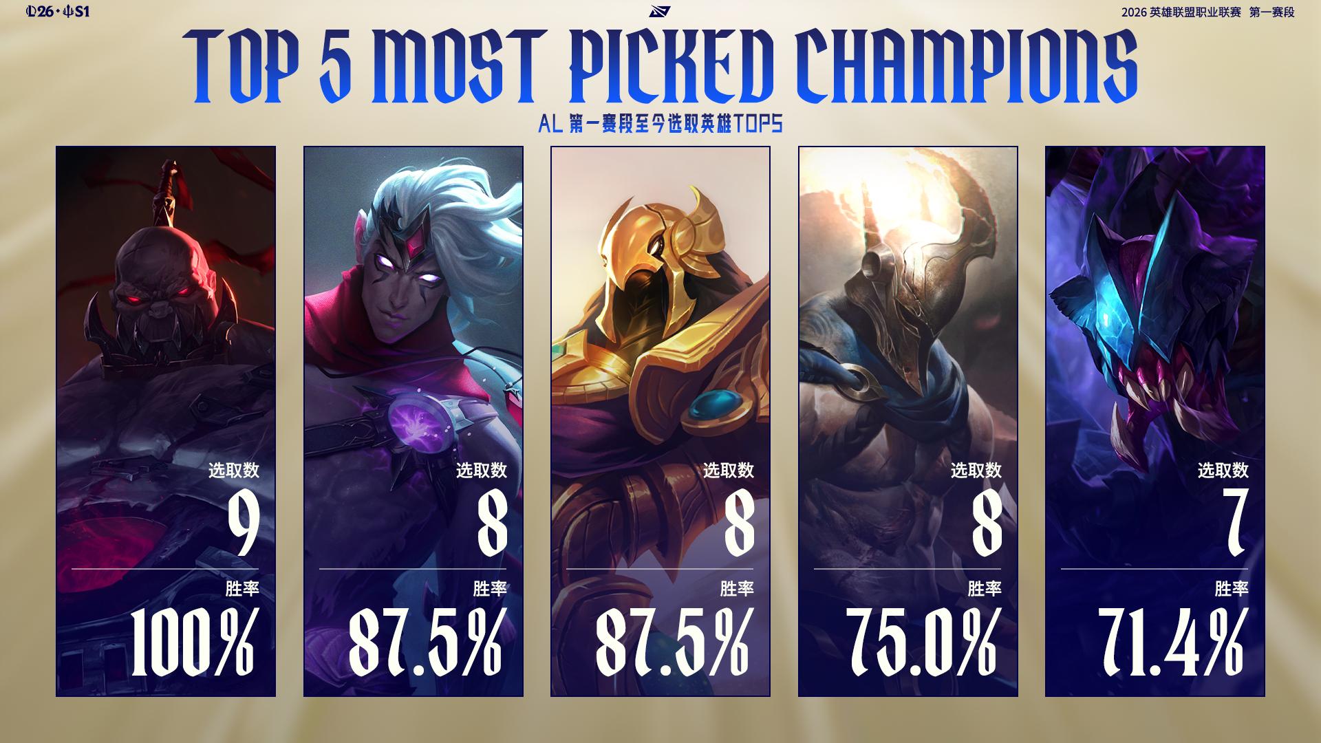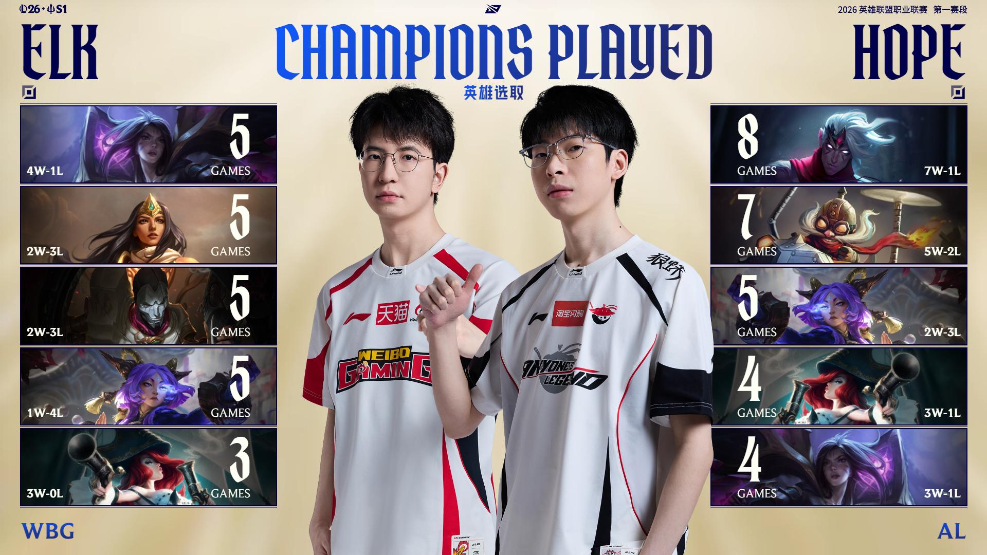 2026LPL第一赛段至今,WBG与AL选取英雄TOP5如图所示;
