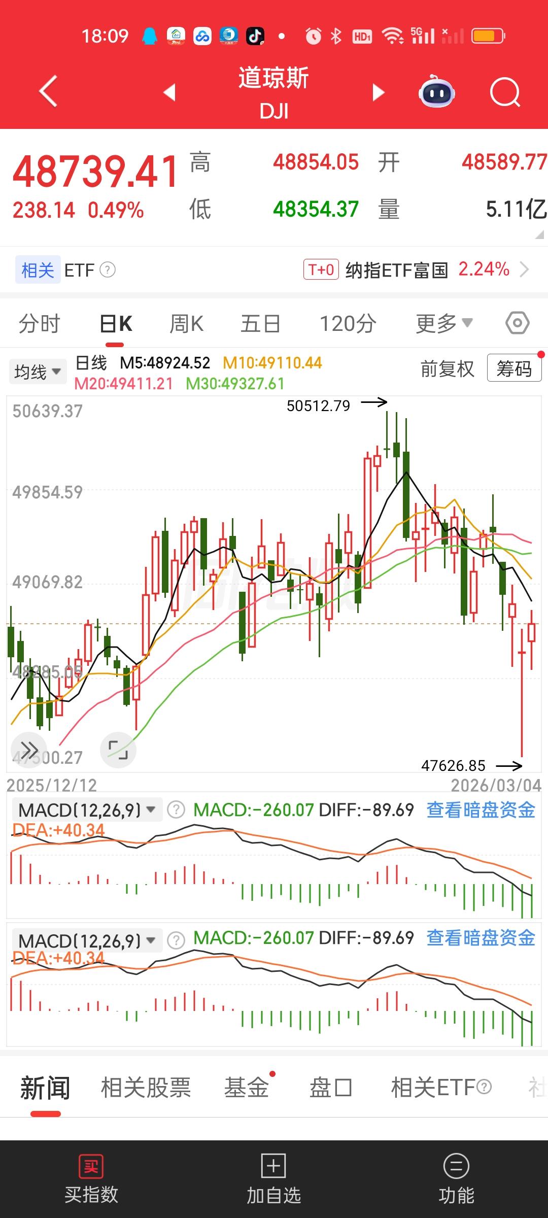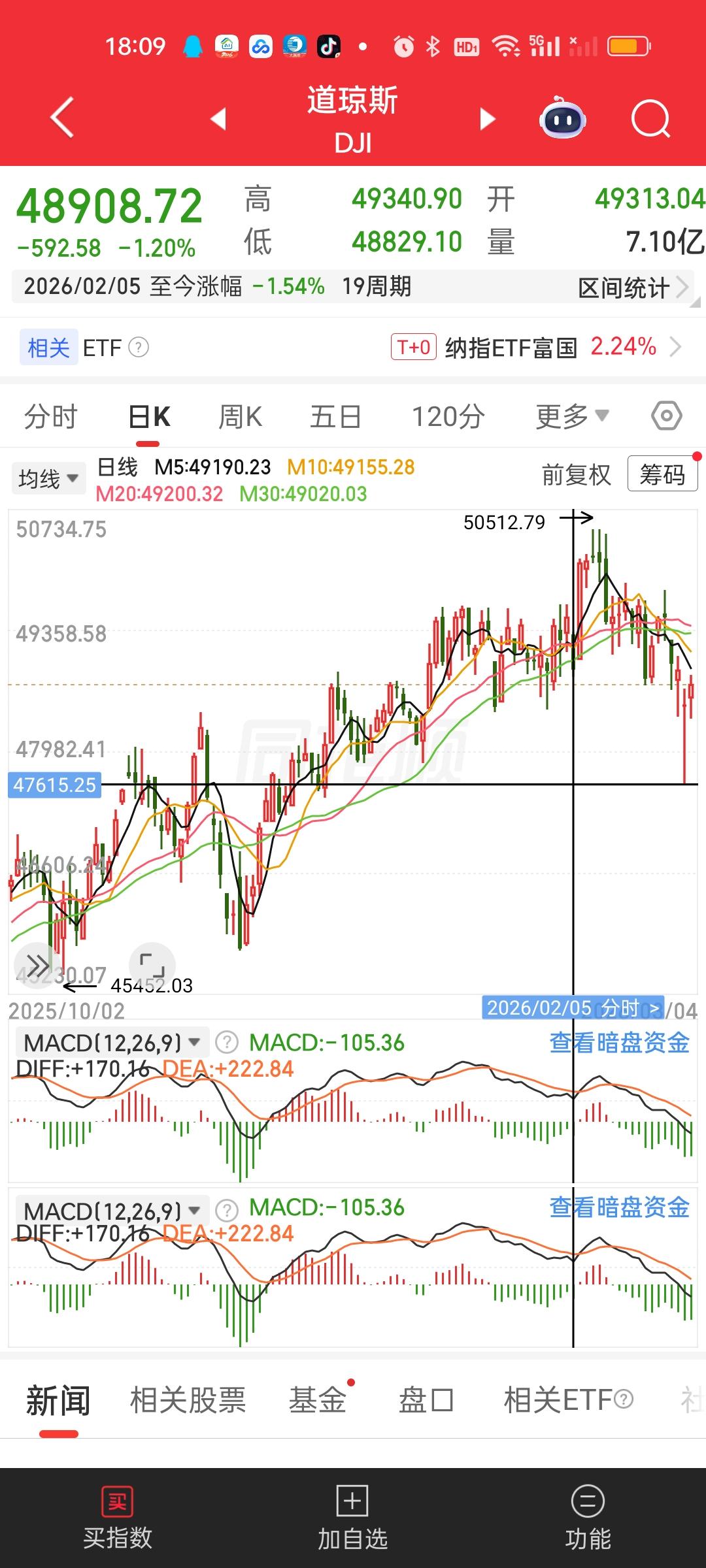 美股这么长的长下影线,不管从哪个角度讲都有补腿的需求吧!收盘48739,腿的底部47615,48739-47615=1124,超过1100点的距离啊,47615/48739=0.9769, 2.31%的下跌空间。怎么可能留这么长的腿呢?所以下跌还会继续!