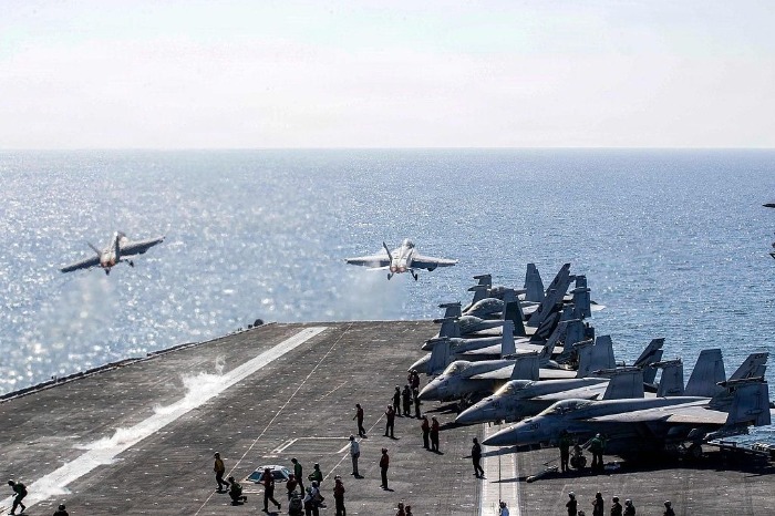 △当地时间3月3日,两架美国战斗机从“林肯”号航母起飞