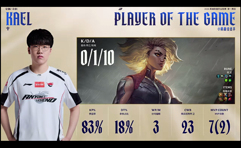 Kael使用芮尔打出0/1/10战绩,斩获AL对阵WBG第三局MVP