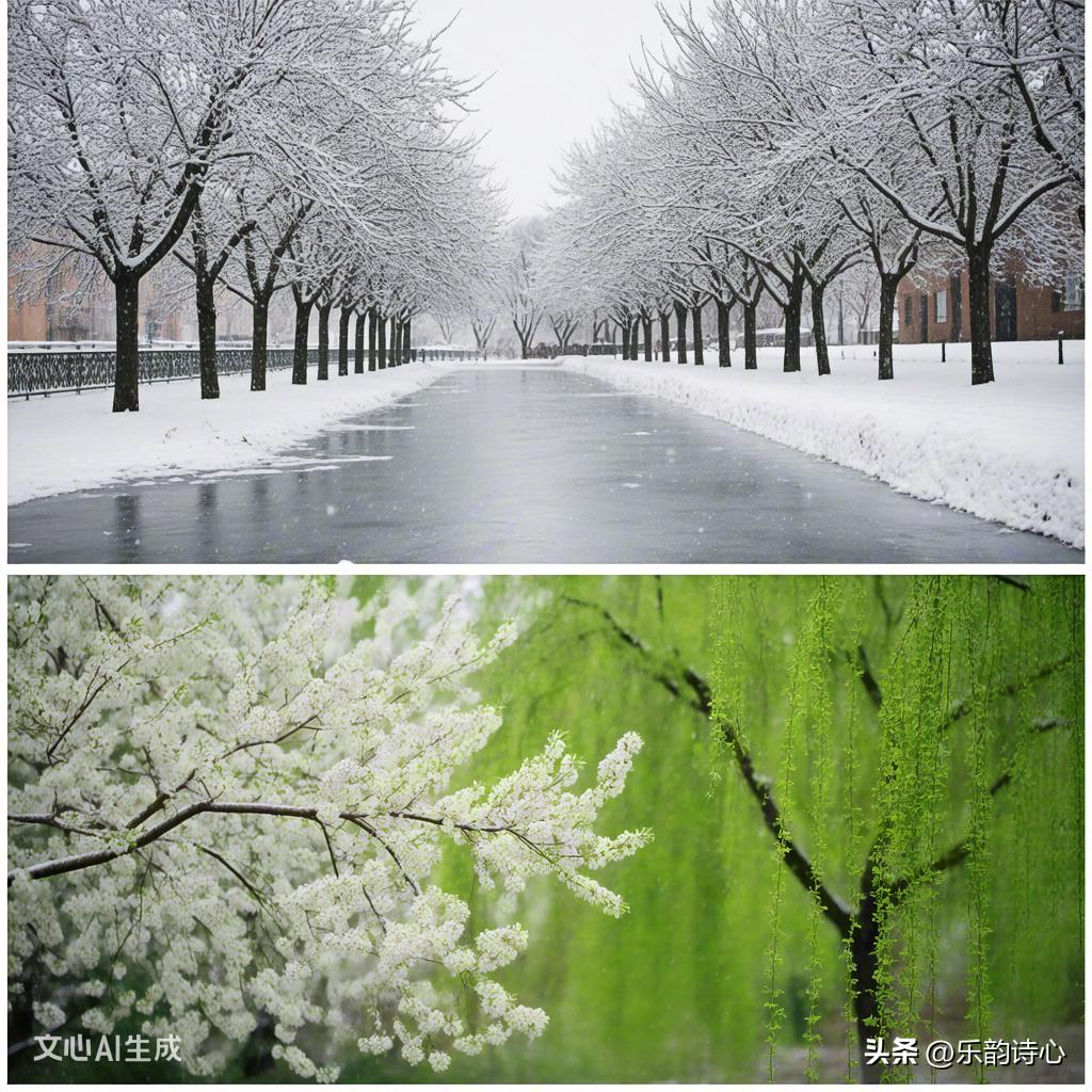 “冰天雪地”描绘出冬天寒冷、洁白,广袤的景象,是冬季典型的特征;“柳绿花红”则展现了春天到来时,柳树抽芽、花朵绽放的生机勃勃之景,是春季鲜明的写照。“送冬去”和“迎春来”对仗工整,生动地体现了季节的更替,表达了对新一年的美好期许。