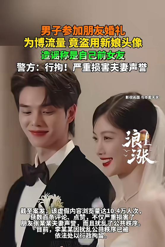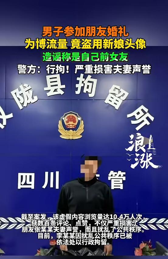 “必须严惩!”四川南充,一男子参加朋友婚礼时,为了博流量,竟然盗用新娘的头像,造谣称新娘是自己的前女友,还伪造聊天记录发到自己的账号上,内容一经发布,引起了大量讨论,严重损害了朋友和新娘的声誉!网友:太缺德了! 在四川南充仪陇县的一个普通婚礼现场,原本的喜庆本该留在红烛与祝福里,可偏偏有人想在这一池春水里搅出名为“流量”的浑水。 2026年3月4日,仪陇警方的通报像一把冷峻的裁纸刀,切开了这起荒诞“婚礼造谣案”的最后遮羞布。此时的李某,或许正在狭小的留置空间里,清点他那用名誉换来的惨淡战果。 那是谁也未曾料到的婚礼插曲。李某本是受邀席间的宾客,他端着酒杯,镜头对准的却不是新人交换戒指的温情,而是他心中盘算的“数字生意”。 他顺手盗取了新娘的微信头像,在手机那一端轻点屏幕,捏造出一段根本不存在的暧昧对话。在那个虚假的界面里,新娘成了所谓深情款款的“前女友”,而他则是那个被旧爱大方邀约参加婚礼的豁达前任。 这个剧本具备了互联网爆款的一切下流要素:婚恋冲突、旧情难忘、戏剧性的相遇。为了让这出戏显得更像“真的”,李某还顺带曝光了婚礼的具体定位和现场生图。 信息像脱缰的野马,从仪陇的小山村瞬间冲向了10.4万人的屏幕。点赞和评论数字不断攀升,数以百计的人在屏幕另一端窥探、揣测,甚至肆意评判。 这种流量的快感极其浓郁,却又充满了腥味。10.4万人次的围观,对一个新婚家庭而言,不再是社交平台的炫耀资本,而是实质性的网络绞杀和名誉崩塌。 这对新人没有选择沉默忍受,也没有在酒席上撕扯扭打。当张某某夫妻看到那个曾称兄道弟的“朋友”在网上编造的恶毒谎言时,他们做出了2026年法治环境下最理智的选择——报案。 法律对这种“幽默感”的容忍度极低。在南充警方介入后,原本精心包装的“旧爱重逢”成了拙劣的诽谤。证据摆在台面上时,李某所有的辩解都显得苍白。 因果律的收网总是迅猛的。因为对公共秩序的扰乱和他人人格权的践踏,行政拘留成了李某为那10万流量付出的现金代价,也是对他“数字寄生癖”的强力纠偏。 这个故事里最令人寒心的地方,莫过于“熟人关系”的背叛。在这个只要有手机就能发声的时代,信任被某些人当成了刺向朋友背后的最轻便的刀刃。 10.4万的流量背后,是三个家庭的震荡和一段友情彻底的粉碎。这种为了一点网络点击量就毫无底线的投机,在四川这块土地上,终究碰到了法治的硬壳。 警方的提醒不仅仅是写在蓝底白字的公文里,更是印在每一个在互联网边缘试探的人心里:你可以追求流量,但别把法律踩在脚底下跳舞。 这场由李某亲手编排的“大戏”,在2026年3月4日正式落下帷幕。他没能成为流量时代的宠儿,只在行政处罚通知书上留下了一个不仅丢人、更是丢掉自由的名字。 生活从来不是自导自演的荒诞剧,每个点击、每条评论的背后,都悬着一柄衡量公义和法律的铁尺。这种“泼天流量”,不要也罢。