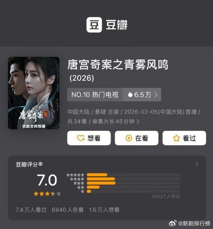 唐宫奇案豆瓣开7.0白鹿王星越唐宫奇案豆瓣7.0恭喜《唐宫奇案》豆瓣7.0分!作为古装探案剧,它把宫廷诡谲和案件推理结合得恰到好处,没有刻意煽情,全靠剧情抓人,白鹿的疯飒人设太圈粉,王星越的白发造型直接惊艳观众