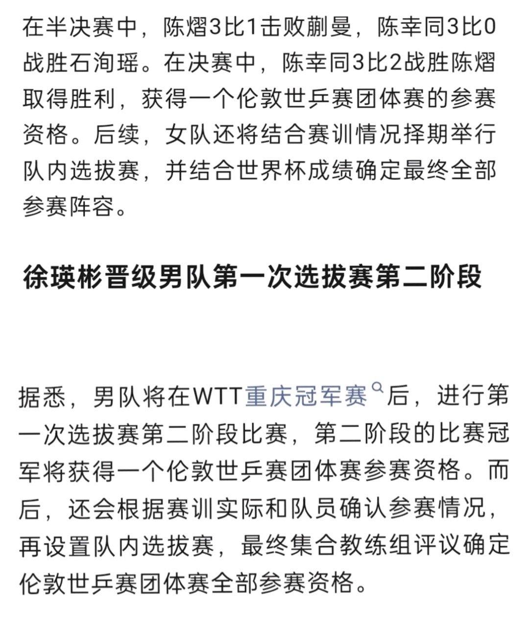 陈幸同获伦敦世乒赛团体参赛资格2026伦敦世乒赛团体赛队内选拔赛陈幸同决赛战胜陈熠,拿到一个团体赛名额。不到一周时间,陈幸同能从被零封的惨败中总结经验,战胜陈熠,可见其对世乒赛的重视程度和充分的准备,希望她能在世乒赛发挥出最好的实力。徐瑛彬在第一阶段选拔赛中胜出,晋级第二阶段,不得不说,他真没辜负球迷给他的定位如果能再次拿到名额,一定要玩命练起来,拿一个实打实的世界冠军,其他队员也要卷起来,还有机会拼一把,加油!