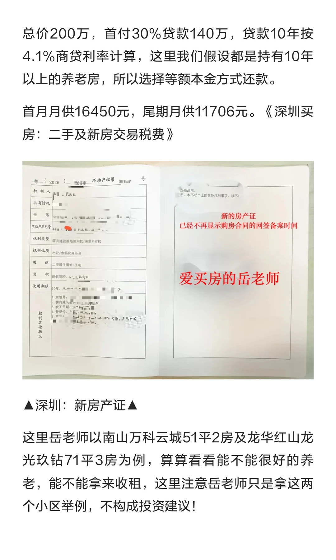 许多朋友想在深圳买一套房子,让自己的老年生活有一份很好的保障,能稳稳的躺赚房子的涨幅或者来自每月租金的收益,但是总觉得这件事很久远或者有一些顾虑。 今天岳老师跟大家一起详细算算这笔账,以深圳2026年楼市政策、买入一套总价200万的房子,能不能很好的退休养老?以及聊聊大家的担心和顾虑。