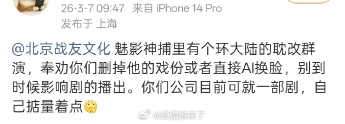 大概因为《逐玉》里有环大陆被换脸的角色,罗云熙粉丝也开始抵制展轩,要求剪掉《魅影神捕》里他的戏份。