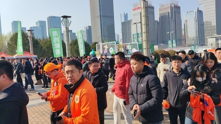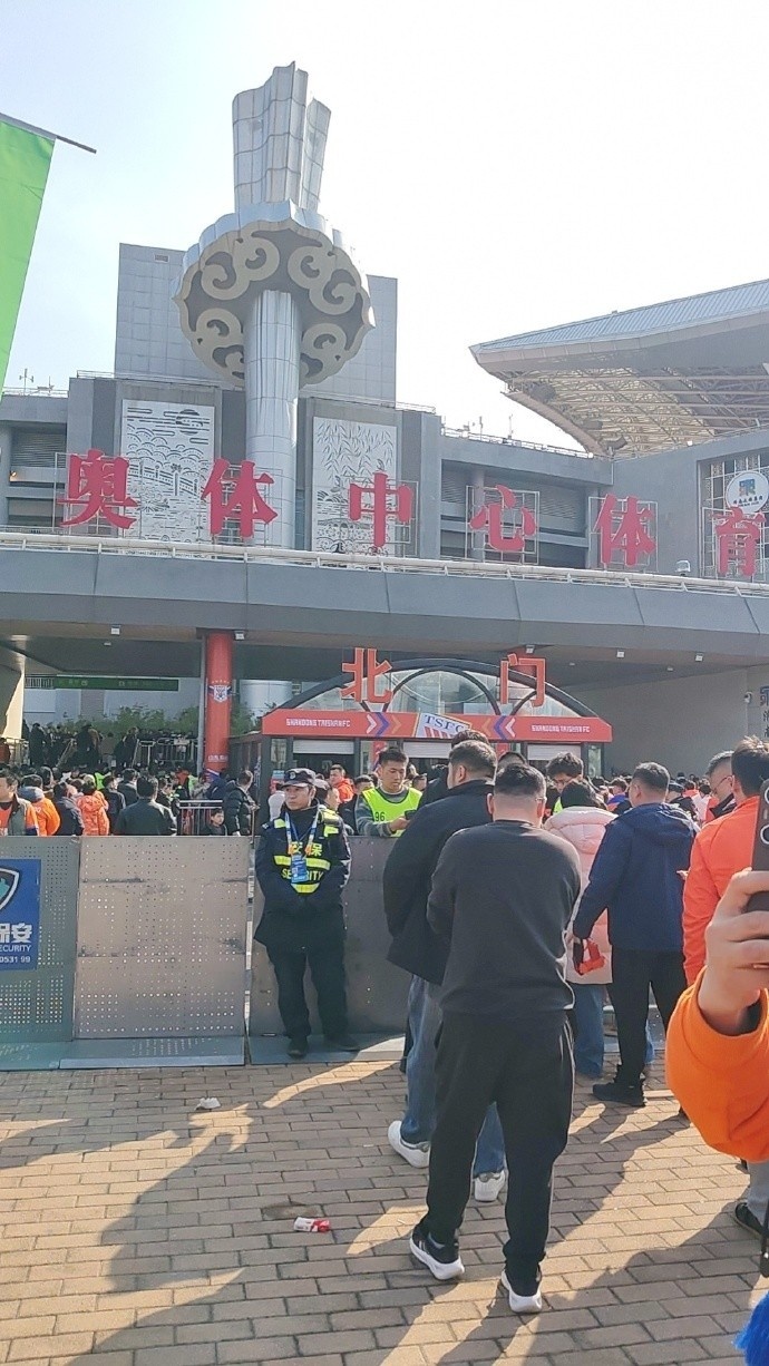 比赛尚未开始但泰山球迷热情高涨,济南奥体中心体育场外挤满了等待入场的球迷。