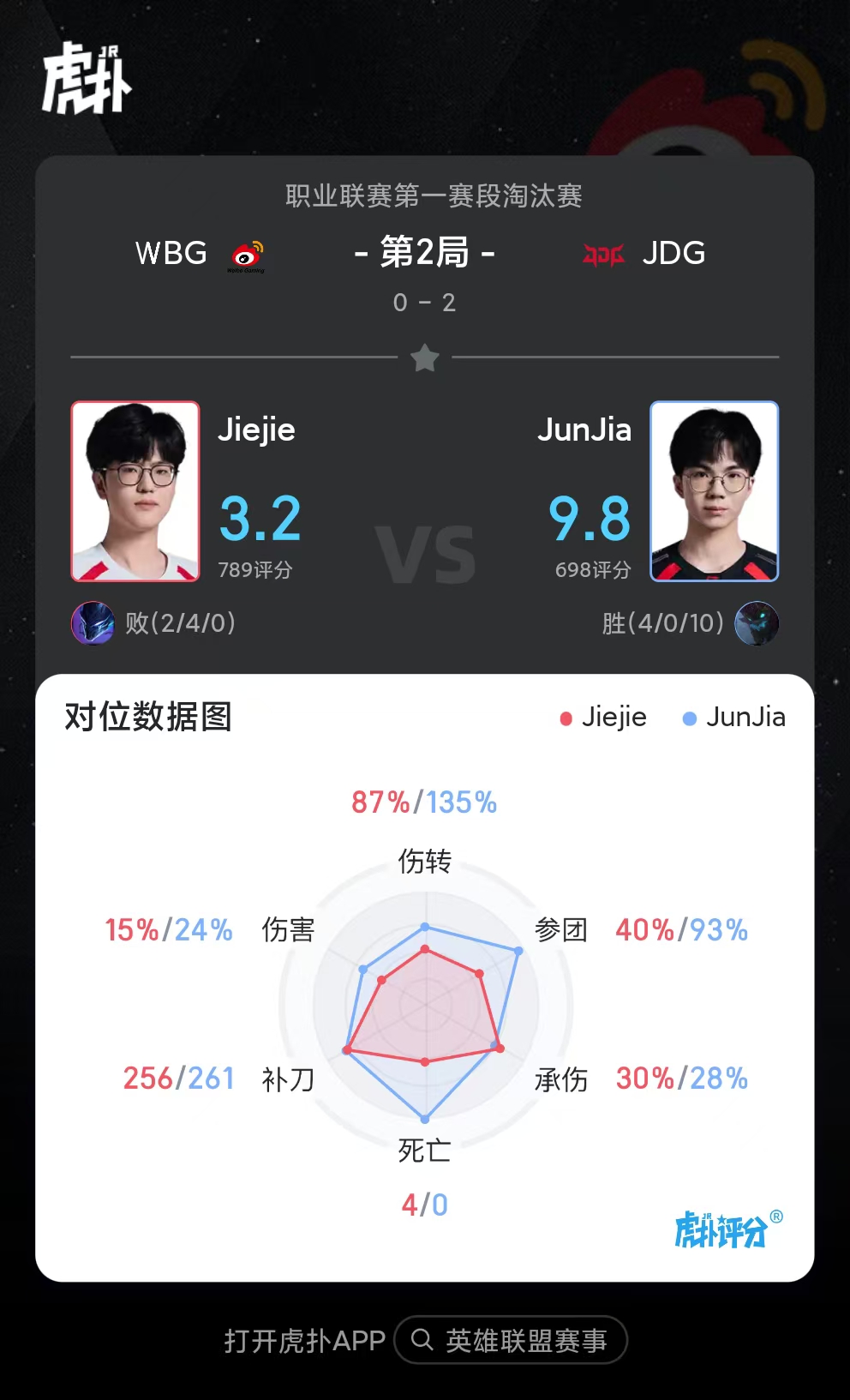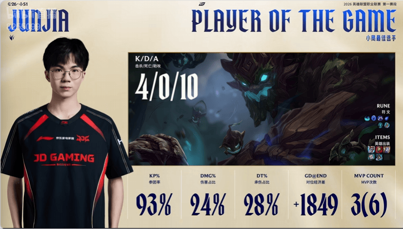 Junjia大树打出4/0/10战绩,拿到JDG对阵WBG次局比赛MVP
