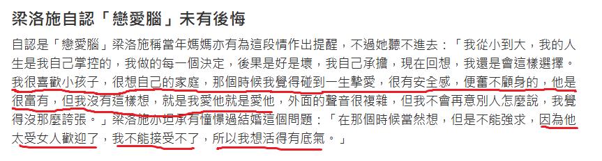 此次访谈中,梁洛施终于首度回应争议,坦然谈及离开的核心原因。她表示,分手并非源于外界猜测的利益矛盾或豪门压力,而是彼时两人对人生轨迹的追求存在差异,“他的世界很精彩,充满了商业版图与忙碌日程,而我想要的是简单安稳的生活,能陪伴孩子成长,拥有属于自己的小日子”。谈及李泽楷,她语气温柔,眼中满是释然,直言“他是很优秀的人,很富有,更重要的是,他曾给过我极致的偏爱与陪伴,是我这辈子认定的一生挚爱”。
