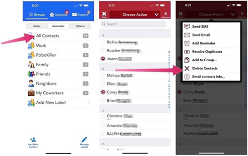 步骤2.选择要删除的所有联系人,然后单击屏幕上部的“选择操作”选项。