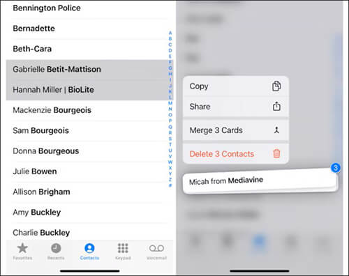 步骤 3. 选择要删除的联系人后,将手指从屏幕上移开。然后,用一根手指按住突出显示的名称之一。