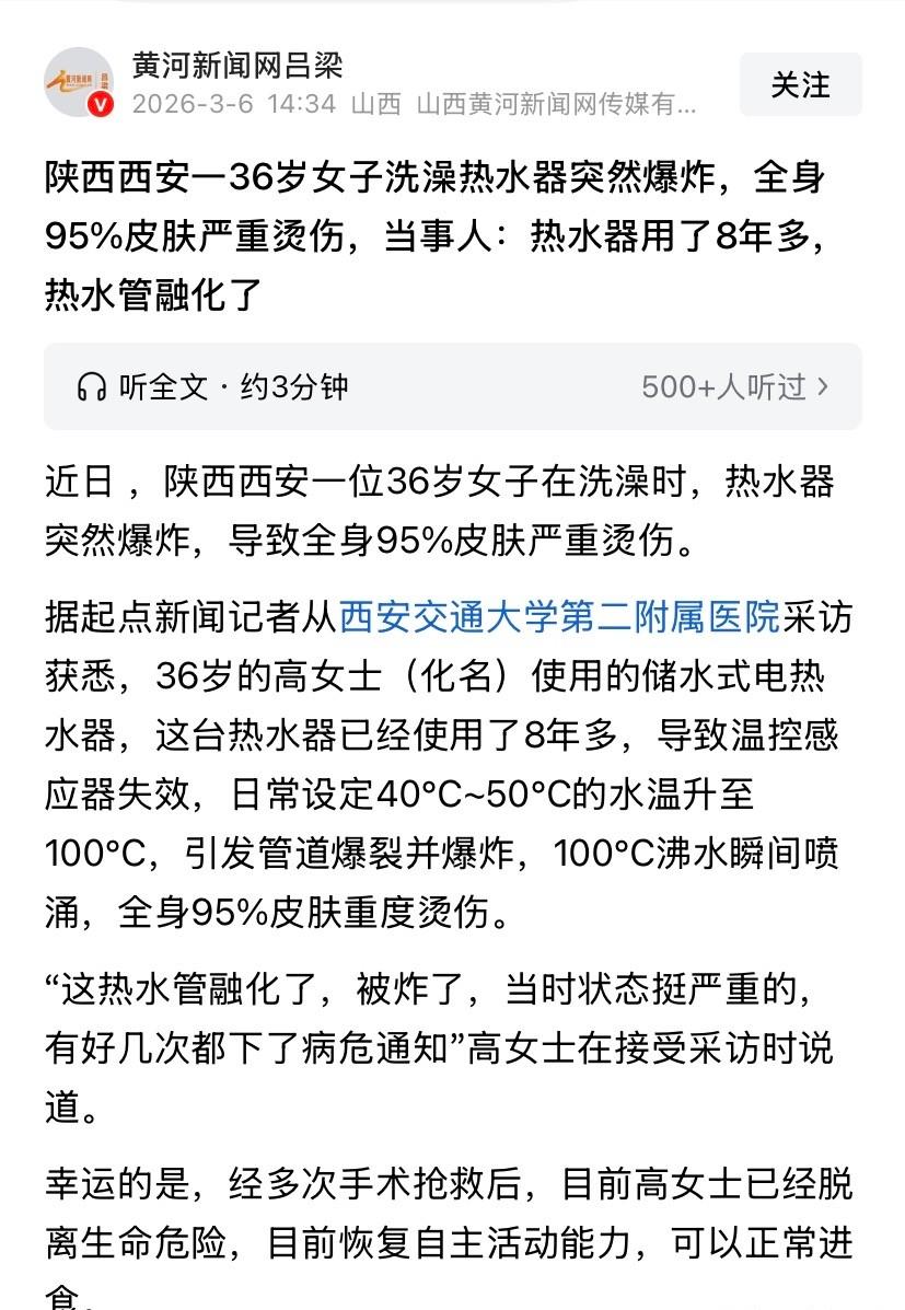 “悲剧还是发生了!”陕西西安,一36岁女子在浴室洗澡,她正洗的舒服时,突然,一声巨响,热水器爆炸,100℃开水瞬间兜头淋下,把她烫的皮开肉绽,全身95%皮肤严重烫伤,医院好几次都下了病危通知书,但女子经过多次手术,还是从鬼门关爬回来,家属本想找热水器厂追责,一查事故原因,都傻眼了。 事发当晚,她刚忙完一天的工作,想着冲个热水澡解乏。 水温调在平时习惯的四十多度,浴室里水汽氤氲,她闭着眼站在花洒下。 爆裂声毫无征兆地响起,紧接着滚烫的水倾泻而下。 狭小空间里没有躲闪余地,她本能地呼救,却很快被剧痛淹没。 家人冲进来时,她已经倒在地上,皮肤大片脱落,几乎失去意识。 送到医院后,医生判断为特重度烧伤,面积达到95%。 休克、感染、器官衰竭风险接踵而至,病危通知书一次次递到家属手中。 多学科团队连夜手术,清创、植皮、抗感染反复进行。 她在重症监护室里度过最难熬的阶段,才慢慢稳住生命体征。 几次生死边缘挣扎之后,情况终于好转,如今已能自主进食和简单活动。 身体留下大面积疤痕,康复仍需漫长时间。 家属原本认定是产品质量问题,准备向厂家索赔医药费用。 检测人员上门勘查,拆开机器后给出的结论让人沉默。 这台储水式电热水器已使用八年多,刚好超过国家建议的安全使用年限。 长期处于通电待机状态,温控感应器老化失灵。 水温持续升高却没有被及时切断,加热系统仍在运转。 水箱内部压力不断累积,最终突破管道承受极限,引发爆裂。 说明书中标注的使用期限与维护要求,从未真正被重视。 机器外观看不出异常,内部零件却早已接近报废边缘。 相关标准明确,储水式电热水器安全年限为八年。 超过期限后,温控器、加热棒、泄压装置故障率明显上升。 很多家庭习惯常年通电,认为随时有热水更方便。 也有人觉得只要还能出热水,就没有更换必要。 水温忽冷忽热、机身异响、泄压阀滴水,这些信号常被忽略。 从法律层面看,产品存在缺陷导致损害,生产者需要承担侵权责任。 若损害源于超期使用或未按规范维护,责任一般由使用者承担。 本案中,事故直接原因被认定为部件老化与长期通电。 厂家并无制造缺陷,索赔请求缺乏依据。 家属情绪复杂,一边庆幸人还在,一边为疏忽付出沉重代价。 医药费和后续治疗费用压在家庭肩上,生活节奏被彻底打乱。 一场日常洗澡,变成改变人生的意外。 家电不是可以无限使用的耐用品,安全年限并非形式提醒。 定期检修和及时更换,往往比事后追责更有意义。