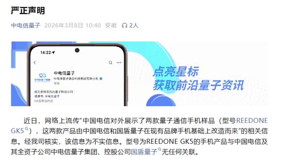 快科技3月8日消息,今日,"中电信量子"公众号发布严正声明,对网络上流传"中国电信对外展示了两款量子通信手机样品(型号REEDONEGK5),这两款产品由中国电信和国盾量子在现有品牌手机基础上改造而来"的相关信息进行辟谣。