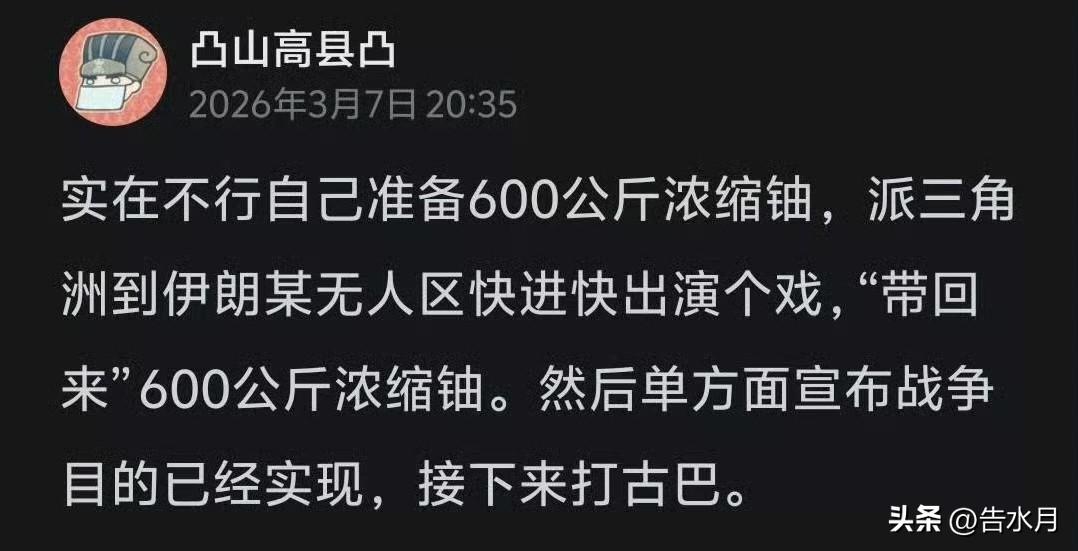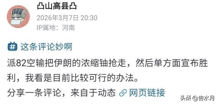 在不想派地面部队大规模进入伊朗的情况下,美国如何赢? 所以美国和以色列开始动脑筋了,他们打算派遣特种部队前往伊朗以夺取伊朗的浓缩铀储备。 有意思的是,这种解决方案我们网友前几天就已经提出来了,还是太了解美国了。 咱们网友也说了,美国再不济自己备点洗衣粉,派点人到伊朗某无人区快进快出演个戏,然后单方面宣布战争目的已经实现,赢就完了!